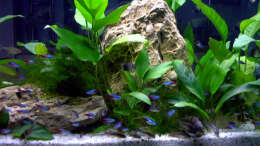 Etliche gro??e und mittlere, löchrige Natursteine, selbstgesammelt. Kleine Höhlen, die entweder schon von Natur aus in den Steinen vorhanden waren oder von mir aus den Steinen gestaltet wurden. 2 kleine Stückchen Moorholz wegen der Zellulose für die Antennenwelse.