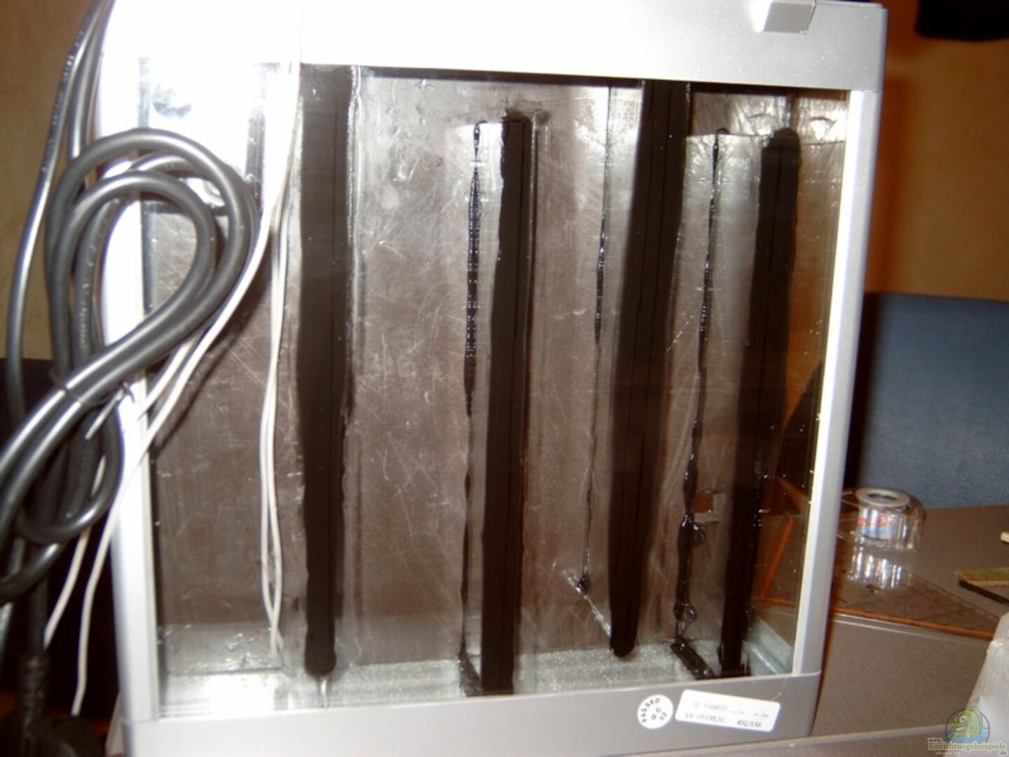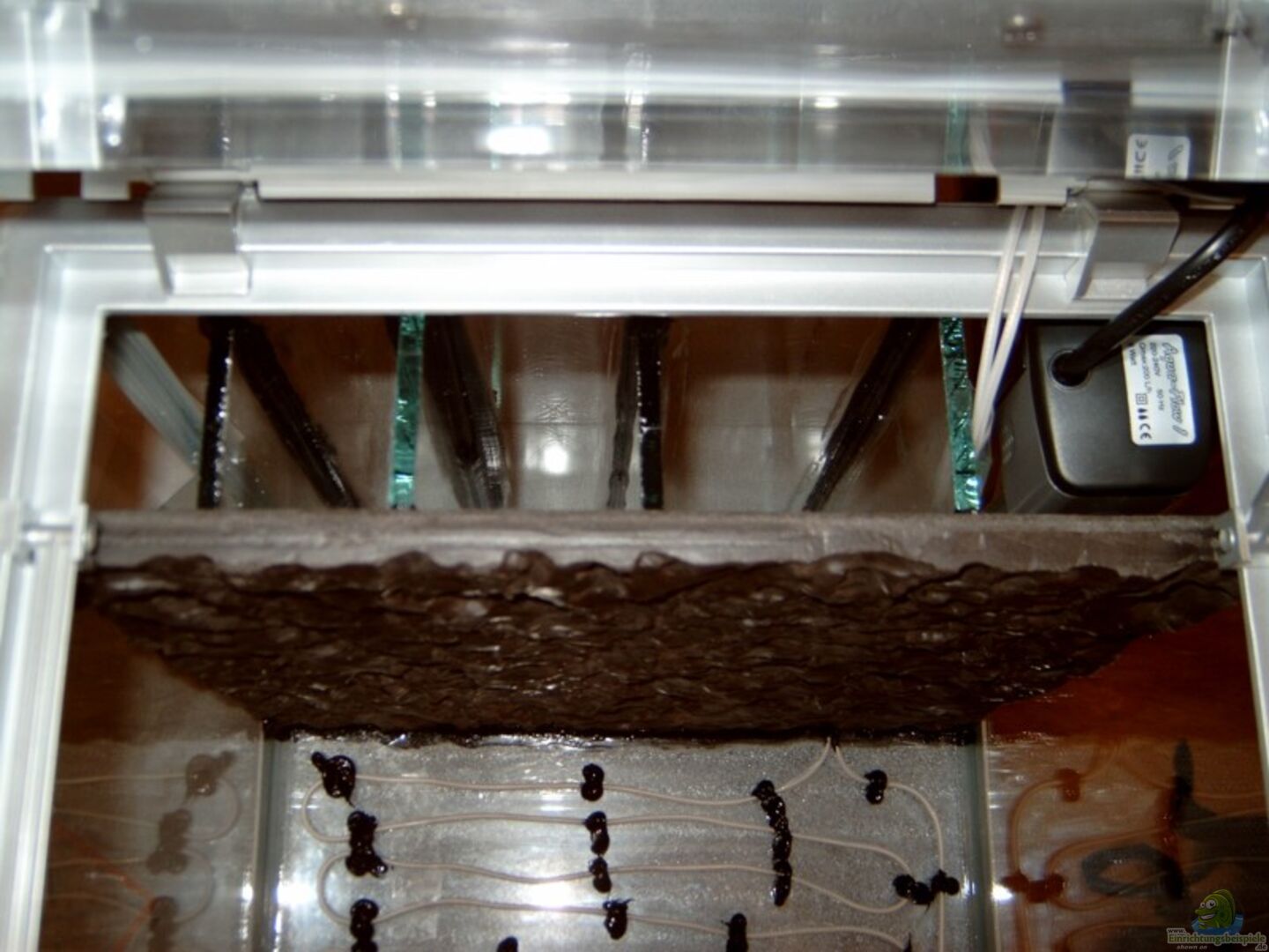 Daher habe ich in das Becken einen 5-Kammer Innenfilter eingeklebt. Gearbeitet wurde mit 4 Glasstegen (25cm x 6 cm x 0, 6cm) und einer Strukturrückwand als Abtrennung zum Aquarium.