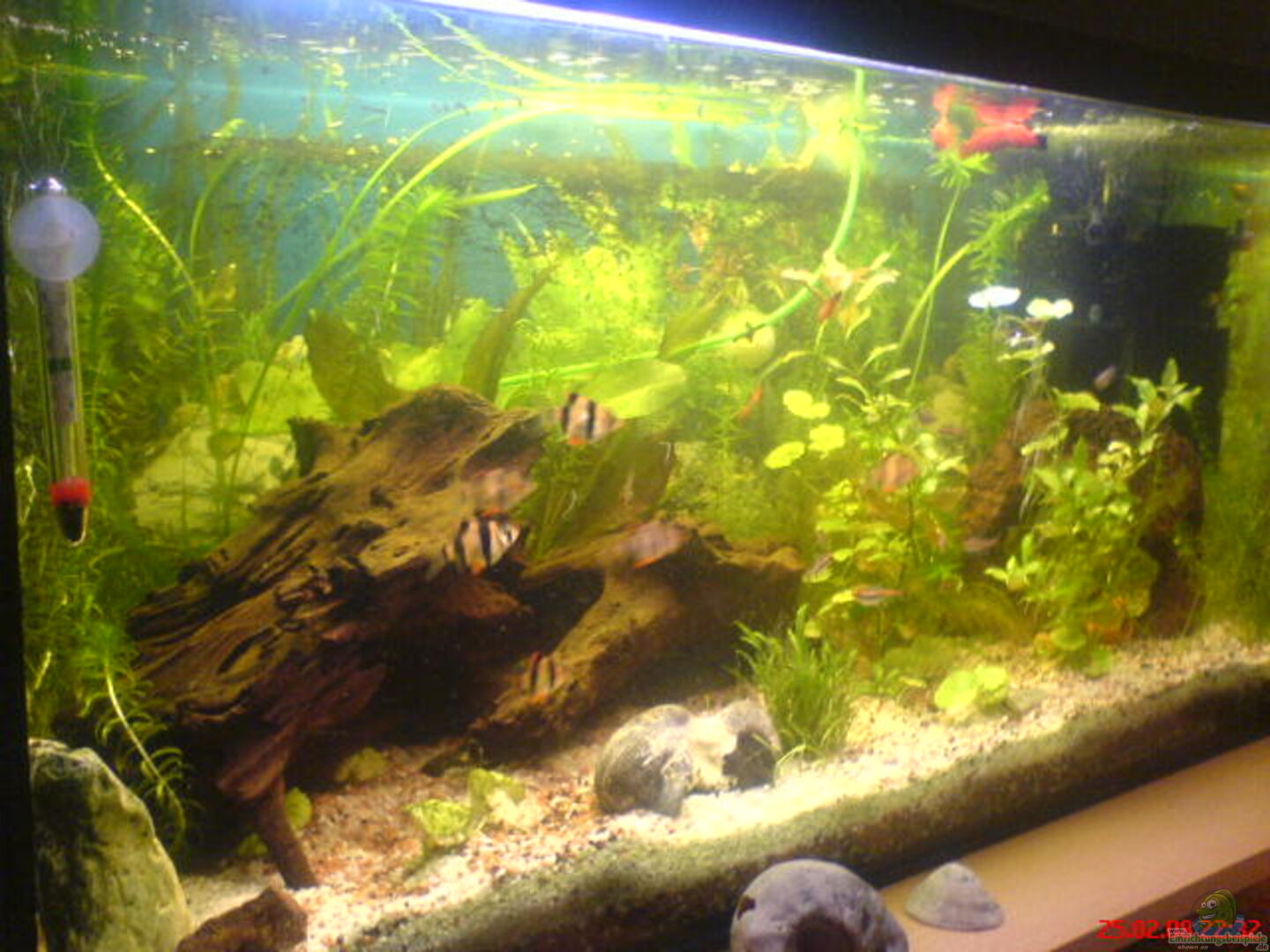 Deine Fischzusammenstellung finde ich ehrlich gesagt nciht gelungen, da Du viele verschiedene Fische hältst, wovon die meisten Schwarmfische sind und in grö?eren Stückzahlen (ab 10 Tiere) gehalten werden sollten.