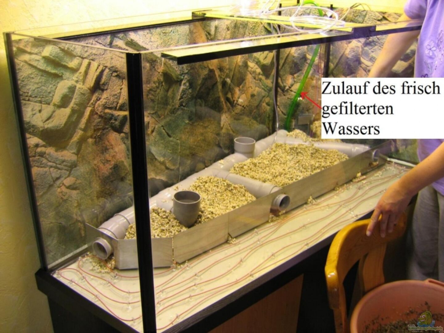 auf den Boden des Beckens entsprechend angefertigte Edelstahlwinkel gestellt haben. Drei davon mit entsprechenden ??ffnungen für die späteren Höhleneingänge. Als Höhle selbst dient HT-Abflu??rohr aus dem Baumarkt. Die Eingänge von vorne jeweils mit 50mm Durchmesser, dahinter jeweils mit Erweiterung auf 70mm. Alle Dichtungen in den Verbindungsstücken haben wir entnommen um Schadstoffe im Wasser zu vermeiden. Die Dichtungen werden im Aquarium ja auch nicht benötigt. Anschlie??end wurden die Edelstahlwinkel mit Back-To-Nature Rückwänden beklebt (Aquariensilikon) und die Höhleneingänge entsprechend den Rohren ausgeschnitten. Damit man beim normalen Hinsehen nicht direkt auf die Rohre guckt, stehen davor noch kurze Eingänge aus Ton. In das Höhlensystem wird aus einem Bypass frisch gefiltertes Wasser eingespeist, welches zuvor durch eine UV-Lampe gelaufen ist. Das bewirkt eine ständige Durchströmung der Rohre. Die Hinterlassenschaften der Fische werden so aus den Rohren rausgespült. Damit die Fische auch in der Höhle beobachtet werden können, haben wir vorzugsweise ´Geraden´ verlegt und 2 zusätzliche ??ffnungen (70mm Durchmesser) nach oben für entsprechenden Lichteinfall eingebaut. Anschlie??end den Kies aufgefüllt. Auf diese Art und Weise bieten wir den Pflanzen eine 10cm hohe Kiesschicht für die Wurzeln und gleichzeitig den Fischen Schwimmraum, der sonst verloren wäre. Zusätzliche mehr oder wenig schöne Versteckmöglichkeiten an der Kiesoberfläche können entfallen. Zunächst waren wir sehr skeptisch, ob sich die Sache bewährt. Nach einem halben Jahr Laufzeit sind die Rohre jedoch von innen immer noch sauber. Entsprechendes Zubehör ist im Baumarkt, sowie Zoofachgeschäften und im Internet zu erhalten. Bei Fragen schickt bitte eine E-Mail!!!!!