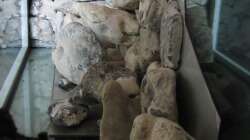 Wasser für den Filter wird im unteren Bereich ( Höhle ) angesaugt und hinter der Dekoration hoch geführt. Hier läuft es über einen Kammfilter und einen Edelstahl-Babyschacht in den Kammerfilter. War es leid, jeden Tag die Garnelen aus dem Filter zu fischen! So habe ich immer den gleichen Wasserstand im Becken undn die Wasseroberfläche wird immer von der Abdeckklappe verdeckt ( Schmutzrand etc. )
