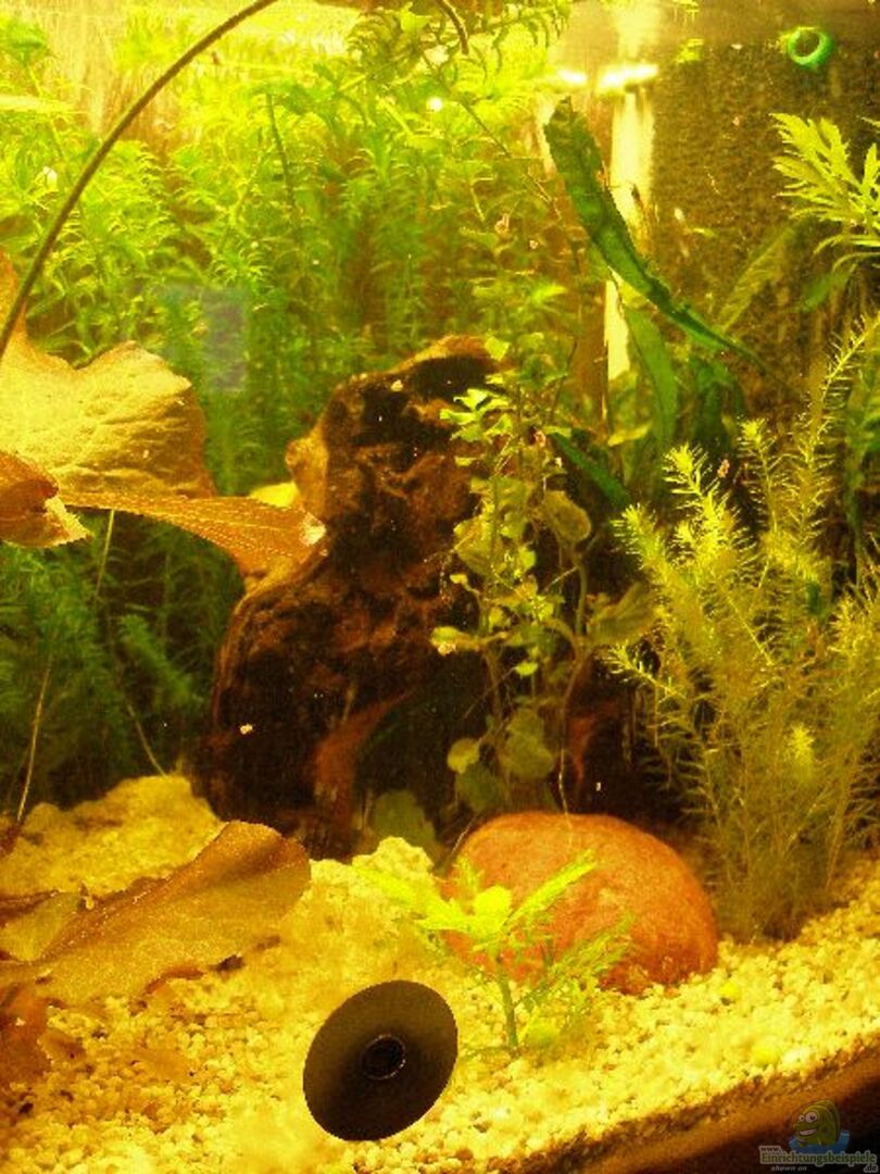 21.10.06: Leichter Mulm zeichnet sich auf der linken Hälfte der Filtermatte ab. Apfelschnecken haben letzte Nacht Javafarn und das Gras probiert (trotz Gurke). Beides schien sehr gut zu schmecken *G* An den Scheiben machen sich Pinselalgen, auf den Pflanzen braune Kieselalgen breit - hoffentlich kommen bald die Pflanzen und meine Bio-CO2 Anlage.