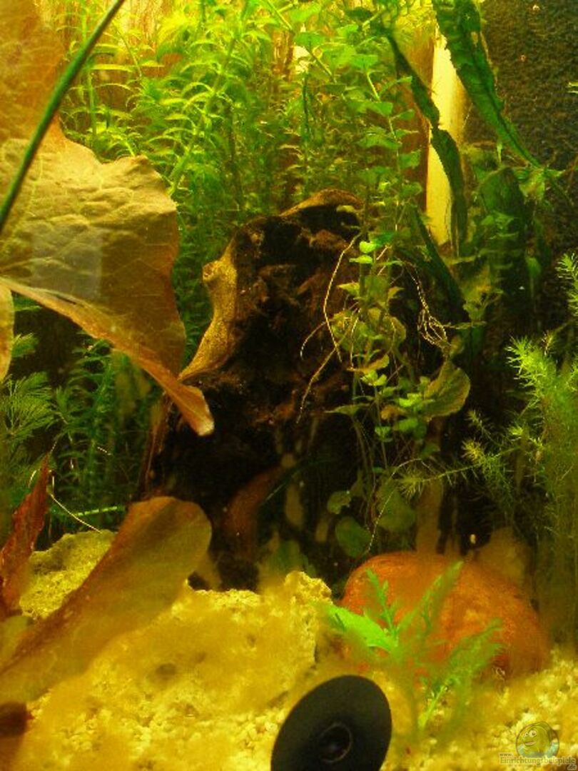 9.12.06 Wasserwechsel, zwei Mopani-Wurzeln herausgenommen (eine faulte), dafür Savannenholzwurzel eingesetzt (Zwergschilderwelse lieben diese!), Lochgestein herausgenommen, dafür zwei Norwegian Pink eingesetzt, Cabomba vorübergehend aus dem Becken ausgesiedelt, allg. Pflanzenpflege