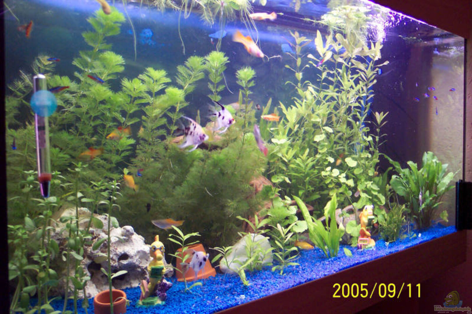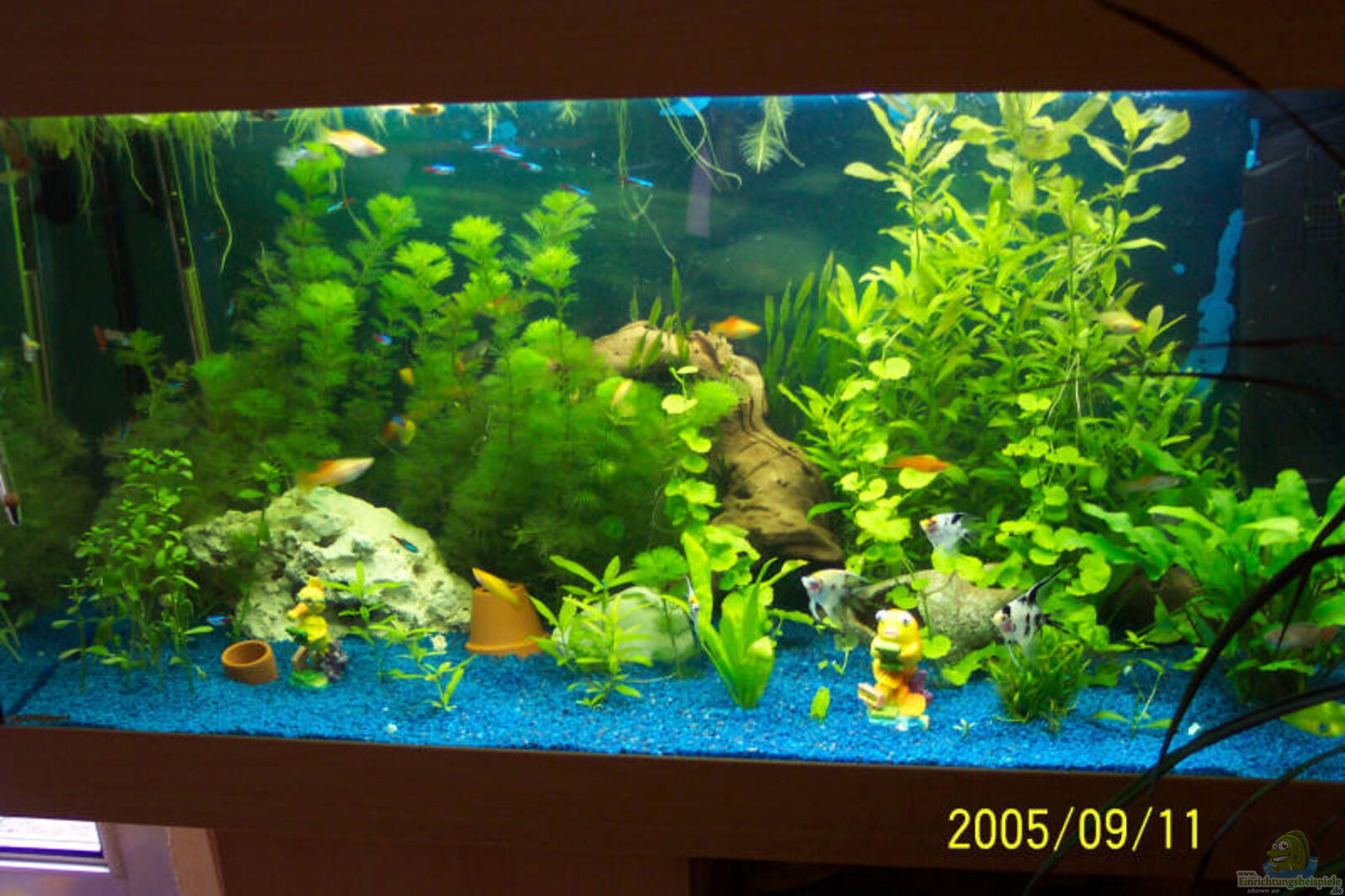 Aquarium läuft seit 01.05.05, gute zwei Wochen darauf erster Fischbesatz.Pflanzen wachsen und gedeihn echt super, obwohl bis jetzt nur einmal Dünger von Dennerle E 15(monatsdüner)Fischen geht es Super nachwuchs von Schwerträger und Guppys bereits vorhanden ;-)
