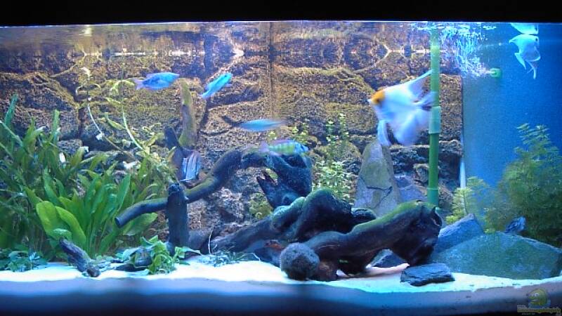 So nun ist alles eingerichtet. Auf einigen Bildern sieht man Rohre aus dem Boden kommen. Das sind 50 mm PVC Rohre die unter dem Sand verlegt sind und miteinander verbunden sind. Welse und Garnelen lieben diese Rohre (hatte sie schon mal drin). Der Mattenfilter und sonst die andere Technik funktioniert auch alles. Wasser ist noch ein wenig trüb. Neue Wurzel bleibt auch unter Wasser. Also bis jetzt alles super.