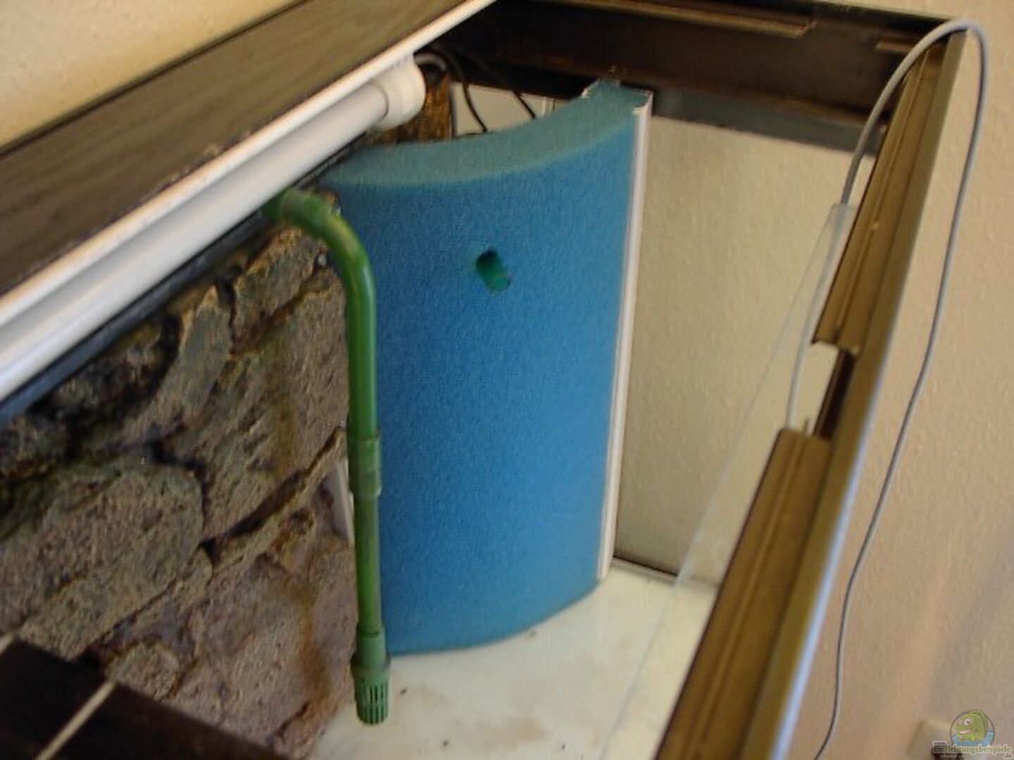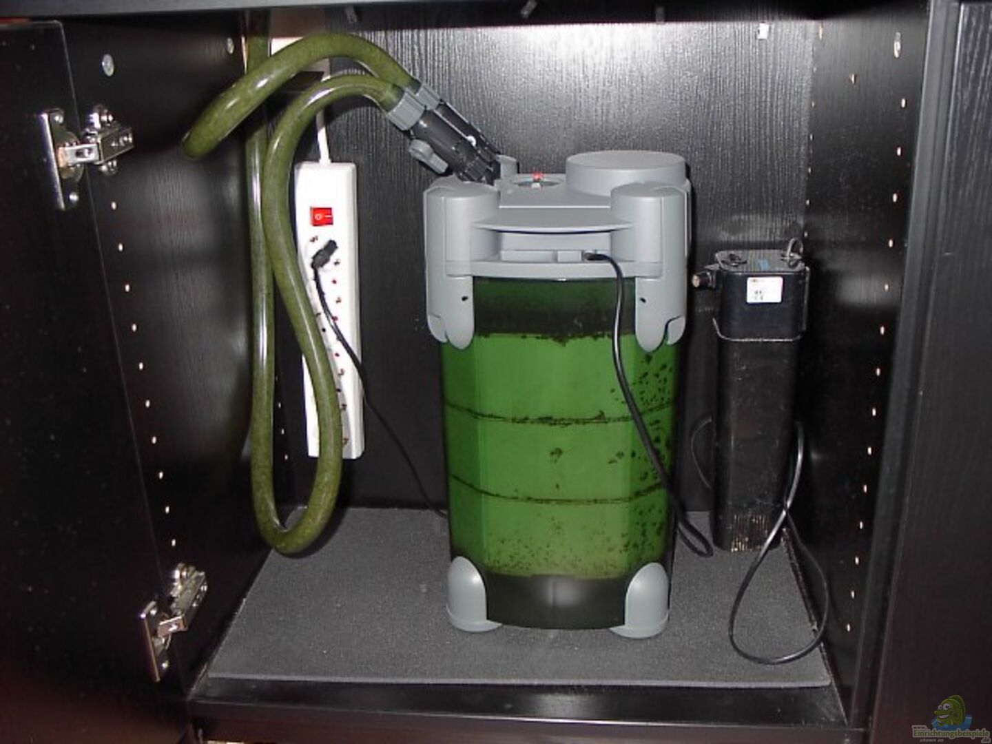 Aussenfilter mit 1200 Liter/Std. Sowie einen selbstgebauten Hamburger (Eck) Mattenfilter. Hinter dem Filter ist die Pumpe und der Heizstab eingebaut.