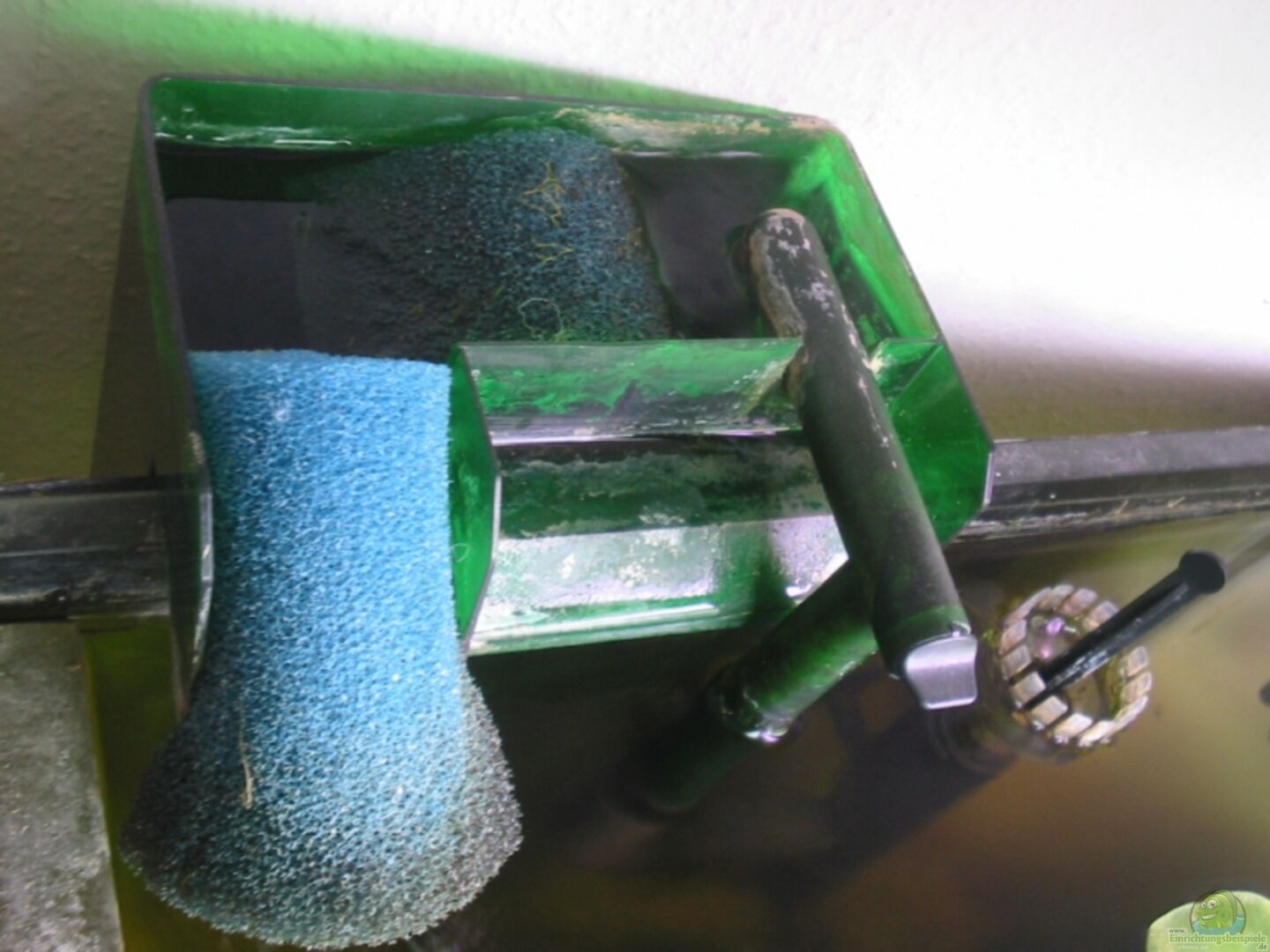 Aufsatz- Au??enfilter: Leistung ca.450l/h Einsatz mit Fiterschwamm, Eichenblätter und Erlenzapfen.