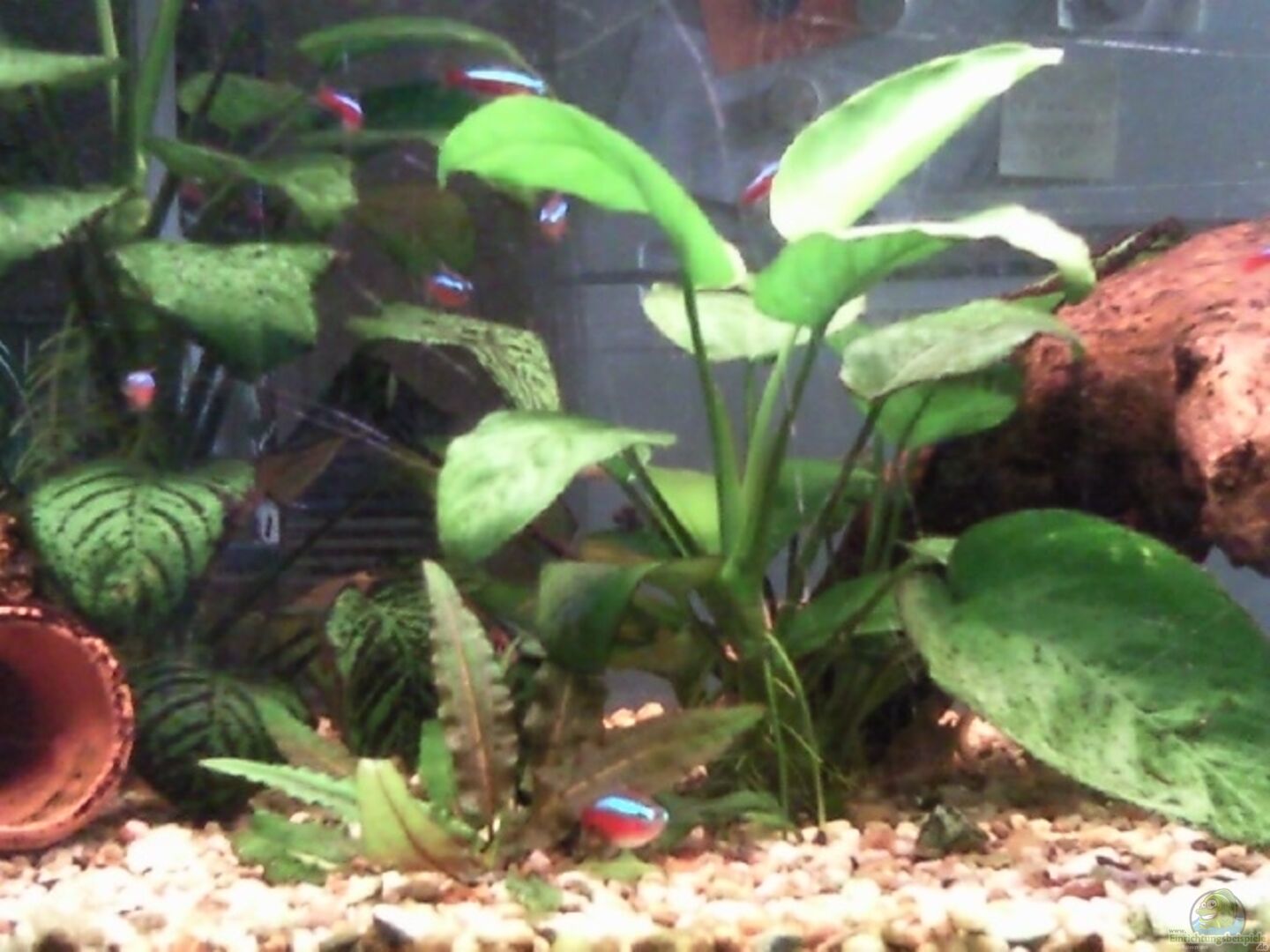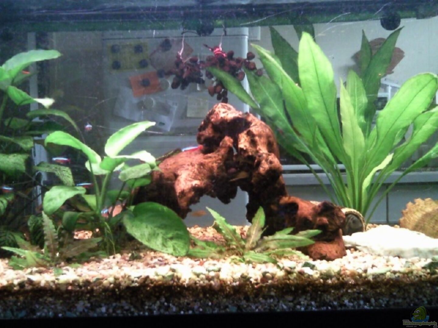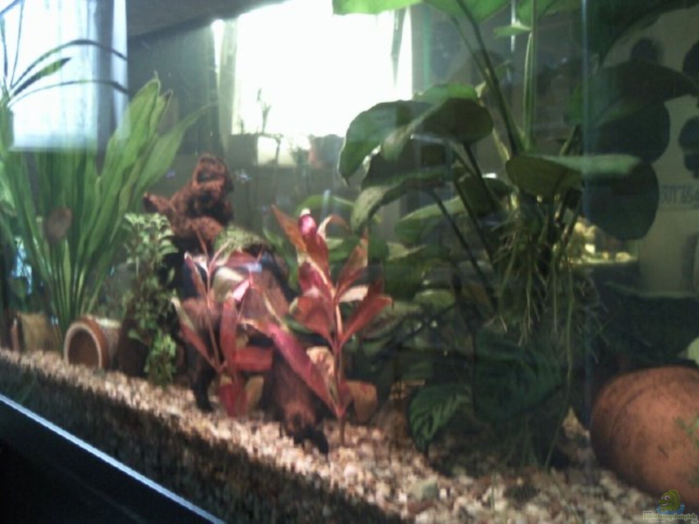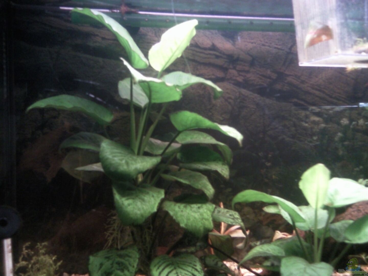 Anubias Barteri, Echinodorus Bleherie- Amazonas schwertpflanze gro??, Wend`s Wasserkelch [genaue Sorte kenne ich nicht], kleine Rosettenpflanzen 2Stück Echinodorus Rainers Kitty, Sind alles Mutterpflanzen und Ableger aus einem 80er Aq. das ich als mein erstes von meinem Opa geerbt hatte.2x rotes Papageienblatt, 2x schmalblättriges Papageienblatt, 3x feines Sumatrafarn, 2x was ich für rote Ludwiegien halte habe ich neu dazugepflanzt. Au??erdem habe ich verschiedene steine mit Javamoos umbunden das ich bis es angewachsen ist in schwimmenden Brutkästen halte.