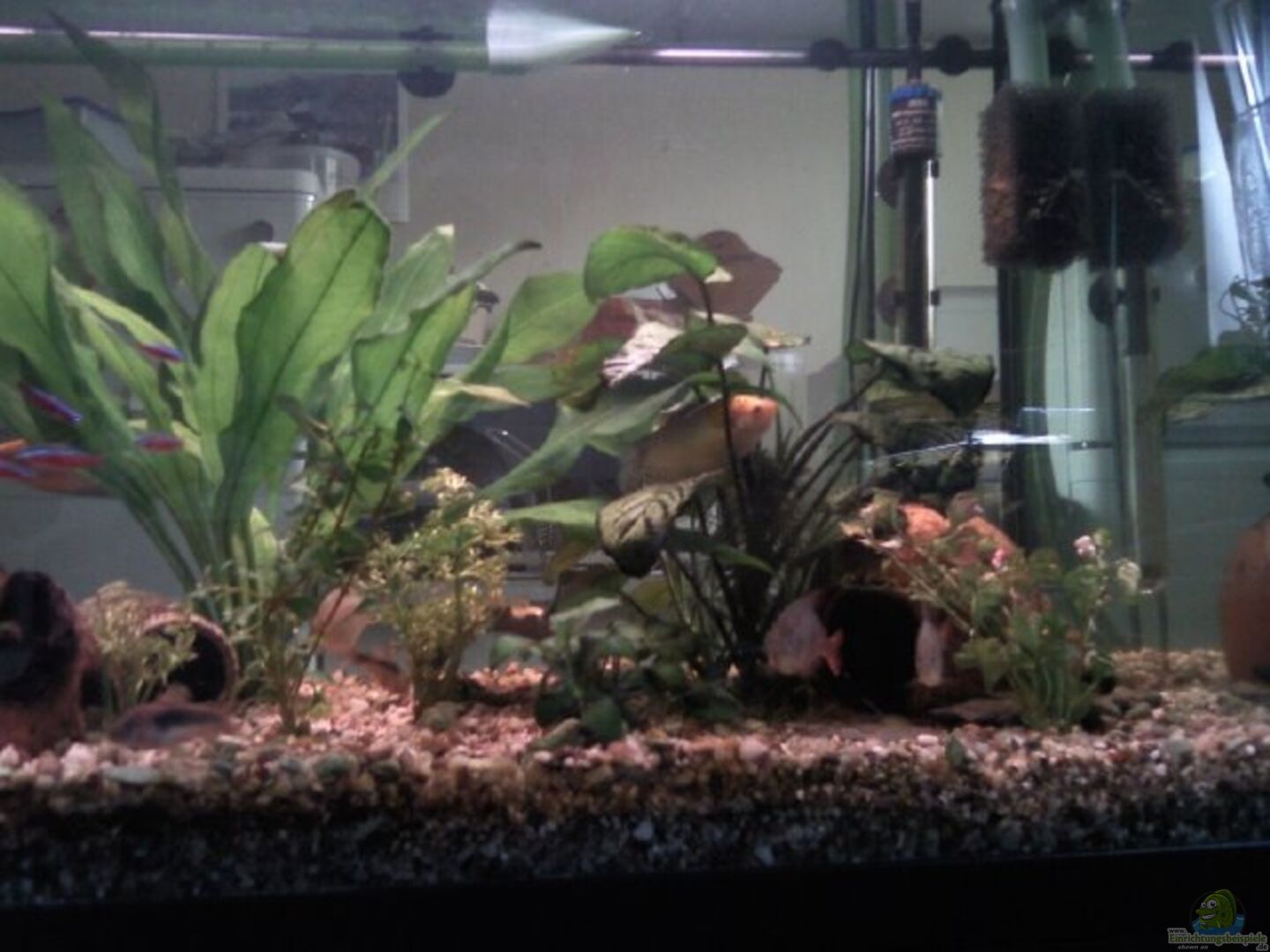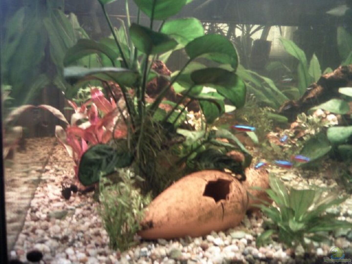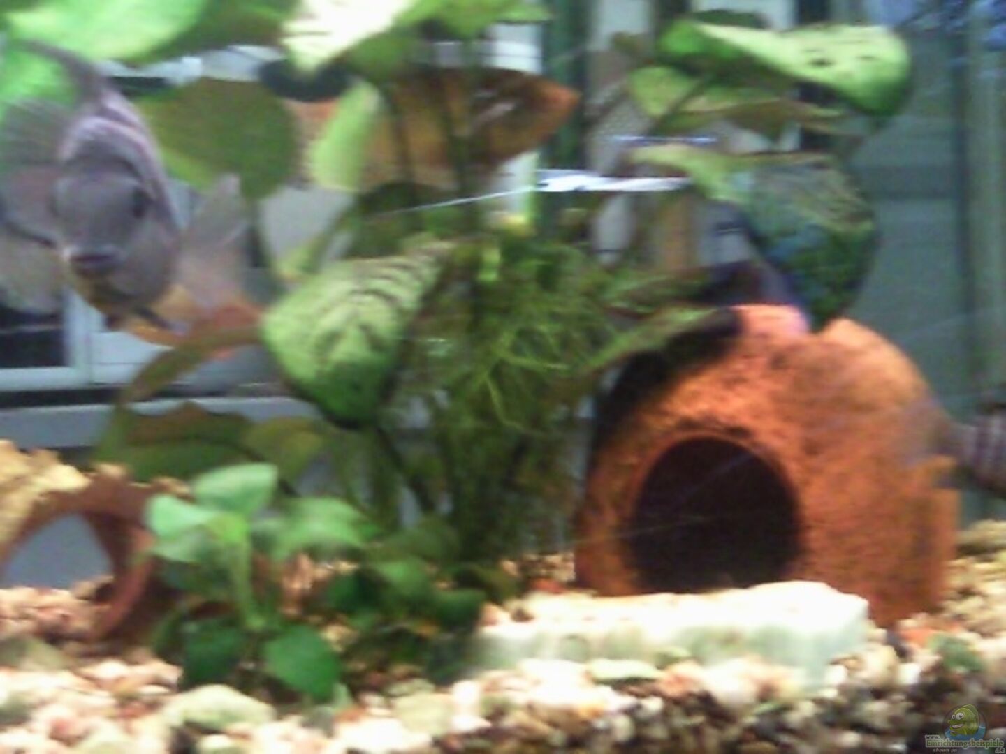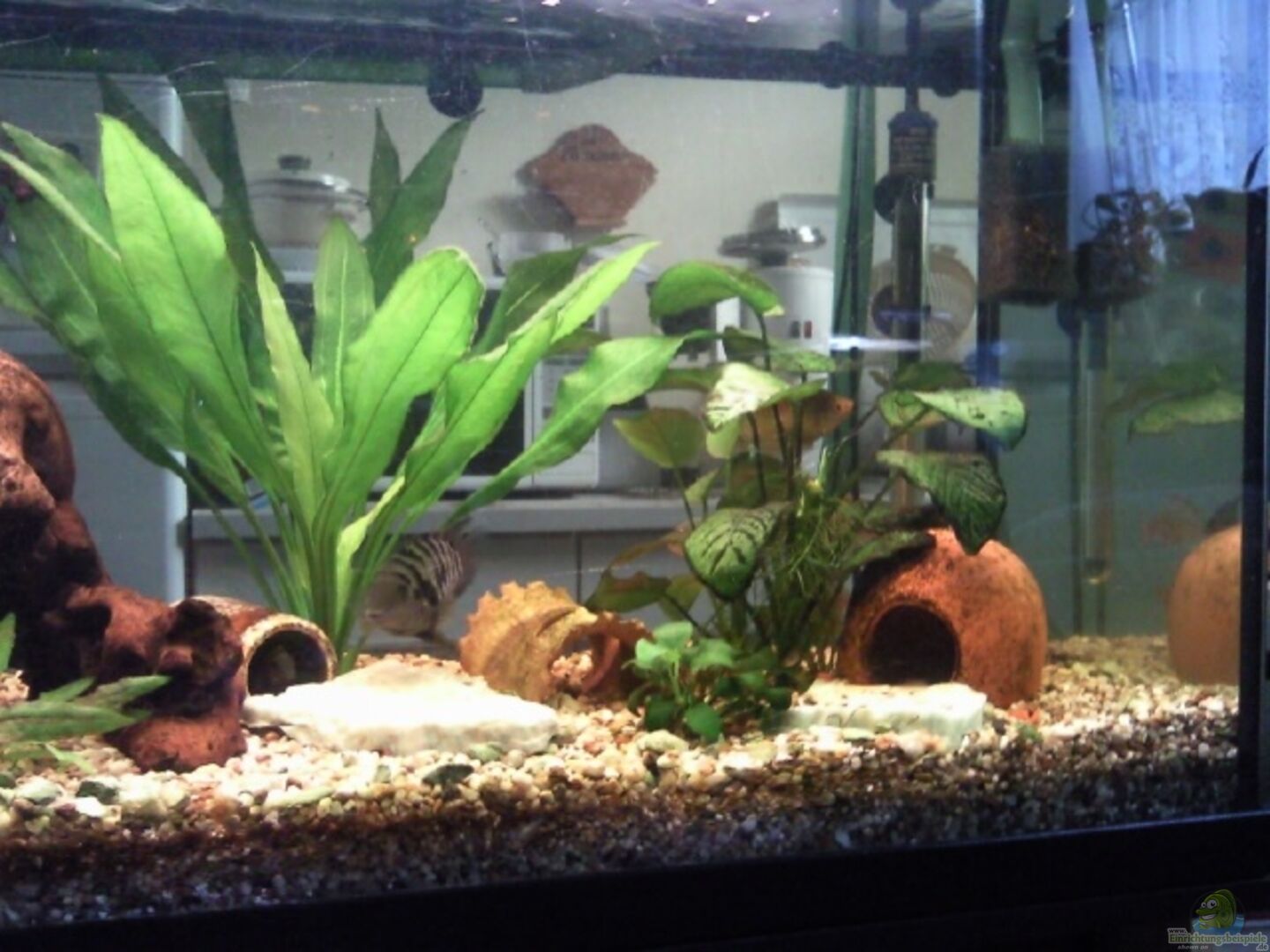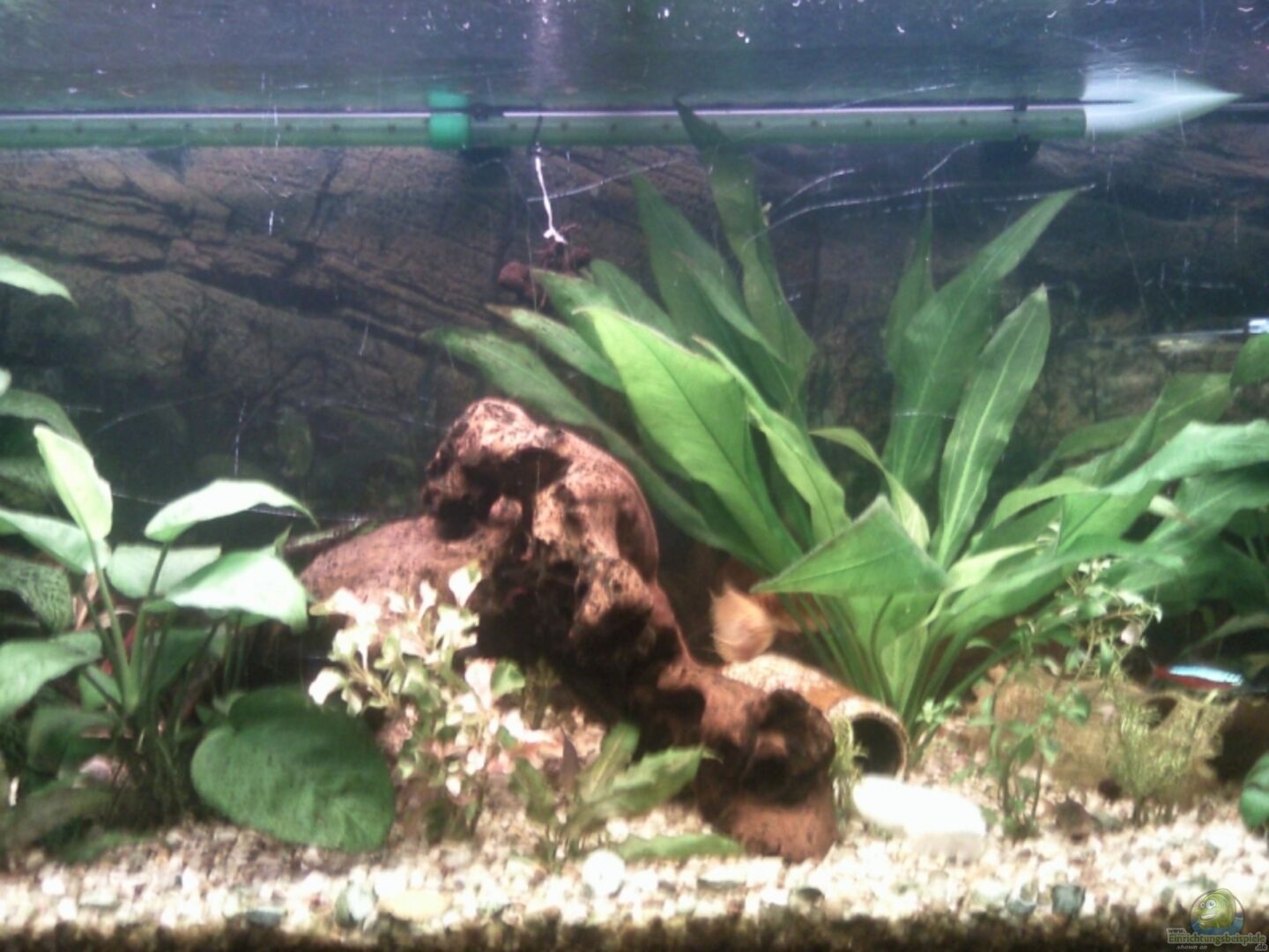 Anubias Barteri, Echinodorus Bleherie- Amazonas schwertpflanze gro??, Wend`s Wasserkelch [genaue Sorte kenne ich nicht], kleine Rosettenpflanzen 2Stück Echinodorus Rainers Kitty, Sind alles Mutterpflanzen und Ableger aus einem 80er Aq. das ich als mein erstes von meinem Opa geerbt hatte.2x rotes Papageienblatt, 2x schmalblättriges Papageienblatt, 3x feines Sumatrafarn, 2x was ich für rote Ludwiegien halte habe ich neu dazugepflanzt. Au??erdem habe ich verschiedene steine mit Javamoos umbunden das ich bis es angewachsen ist in schwimmenden Brutkästen halte.