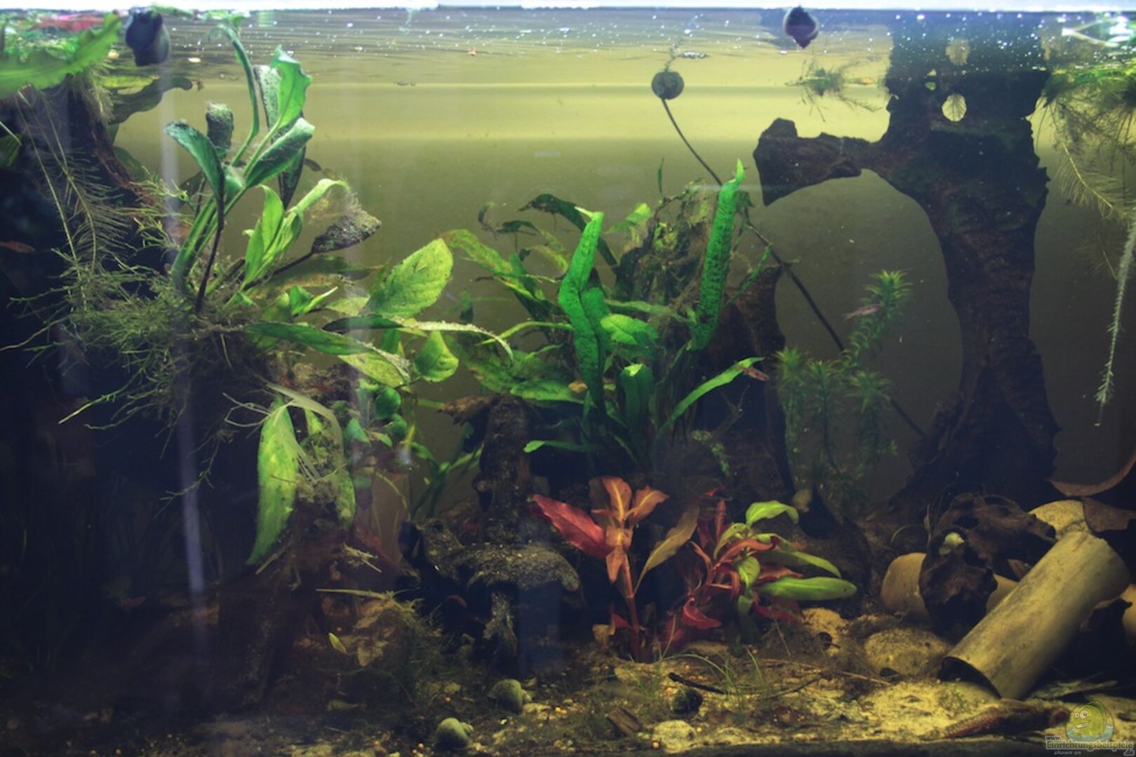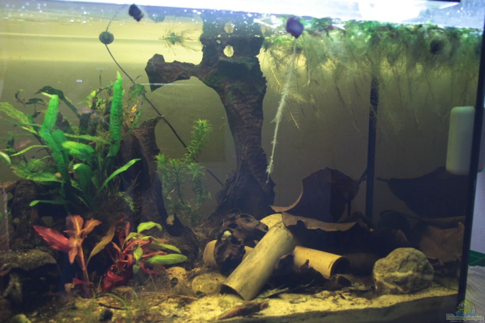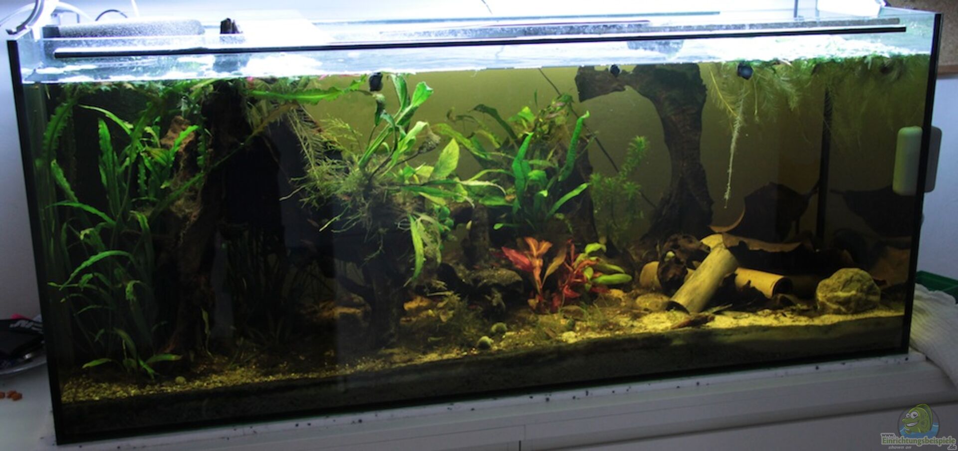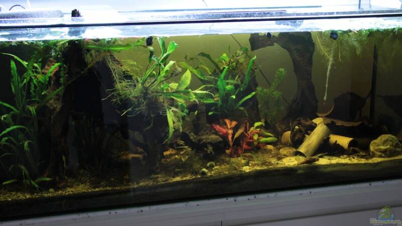 grosse und kleine Wurzeln, Kokosschalenhöhlen, Bambusröhren, Plantanenrinde, 1 Moosball, Steine aus dem Bach, immer mal wieder etwas Laub