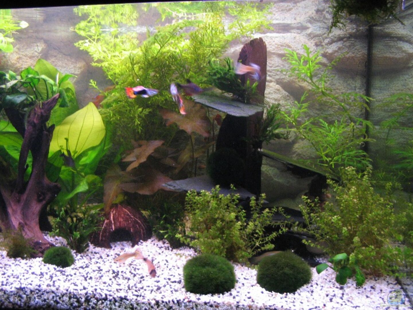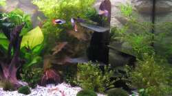 also ich finde gar nicht so viel schlimmes hier, den pflanzenbestand finde ich ausreichend, weil er ja noch wächst. stengelpflanzen immer nur in den hintergrund zu pflanzen wie hier vorgeschlagen wird um einen "panoramablick" zu schaffen, find ich eher langweilig, bei mir wächst alles wild, finde ich viel natürlicher. hab ich so, und ich seh zwar nicht jeden fisch auf den ersten blick, aber is ja auch kein fernseher sondern ein biotop. so, warum ich das angesprochen habe ;-) : ich würde stattdessen noch schwimmpflanzen wie froschbiss reinpacken, der bildet schön lange wurzeln und entzieht dem wasser nitrat, der bei dir schon ziemlich hoch ist ( aber vielleicht haste ja auch kurz vor dem wasserwechsel gemessen )