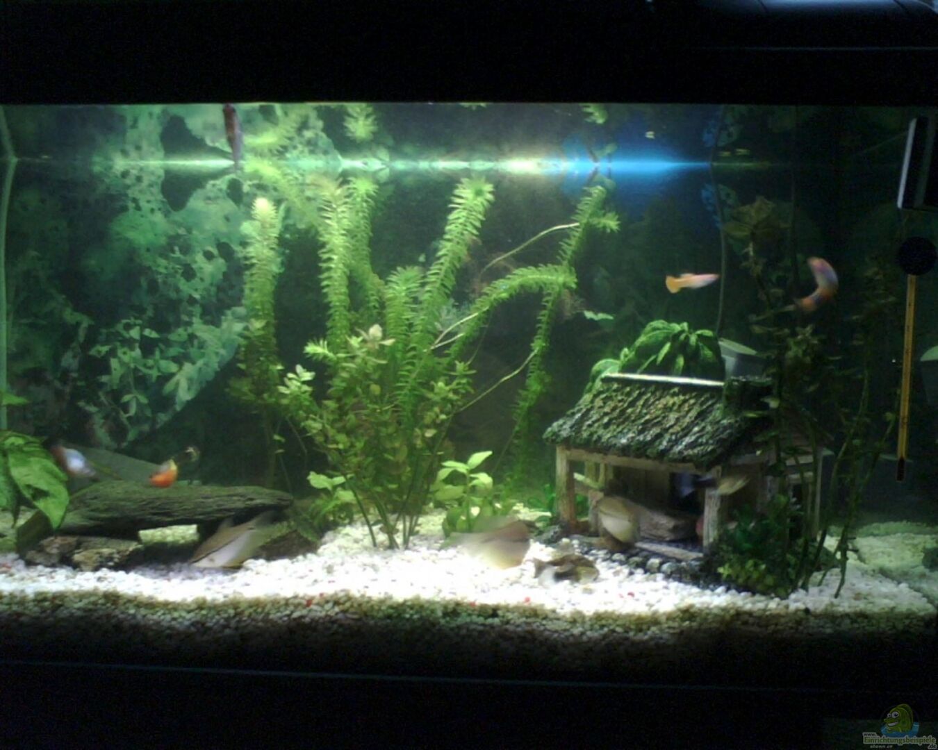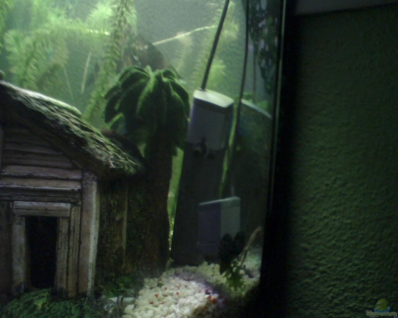 Die Einrichtung ist Geschmackssache. Mir persönlich gefällt sie nicht. Viel zu wenig Pflanzen. Dein Becken sieht nicht natürlich aus. Eigentlich wollen wir Aquarianer den Fischen einen naturnahen Lebensraum schaffen. Es fehtl auf jeden Fall eine Wurzel für Deine Antennenwelse und mind. noch eine Höhle zum verstecken. Die Wurzel brauchen deine Antennenwelse! Sie `nagen` die Oberfläche der Wurzel ab und brauchen dies für ihre Verdauung. Ich würde sagen: Kunsthaus raus, Wurzel rein + mind. noch eine Höhle. Dann noch mehr Pflanzen rein und die Fischsuppe ausdünnen.