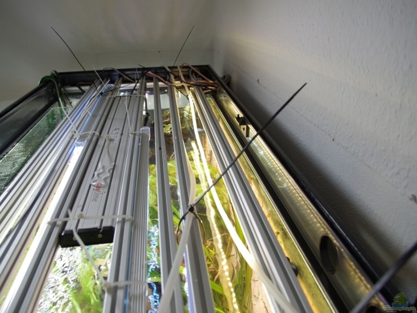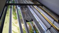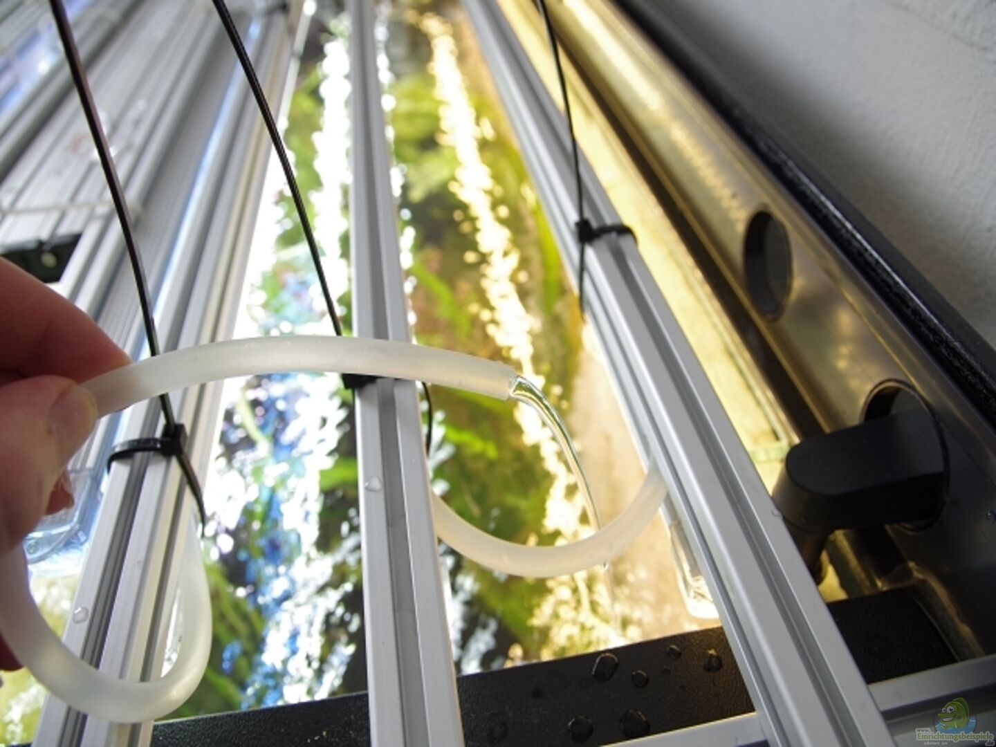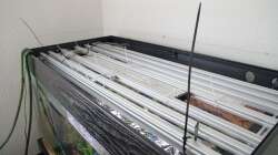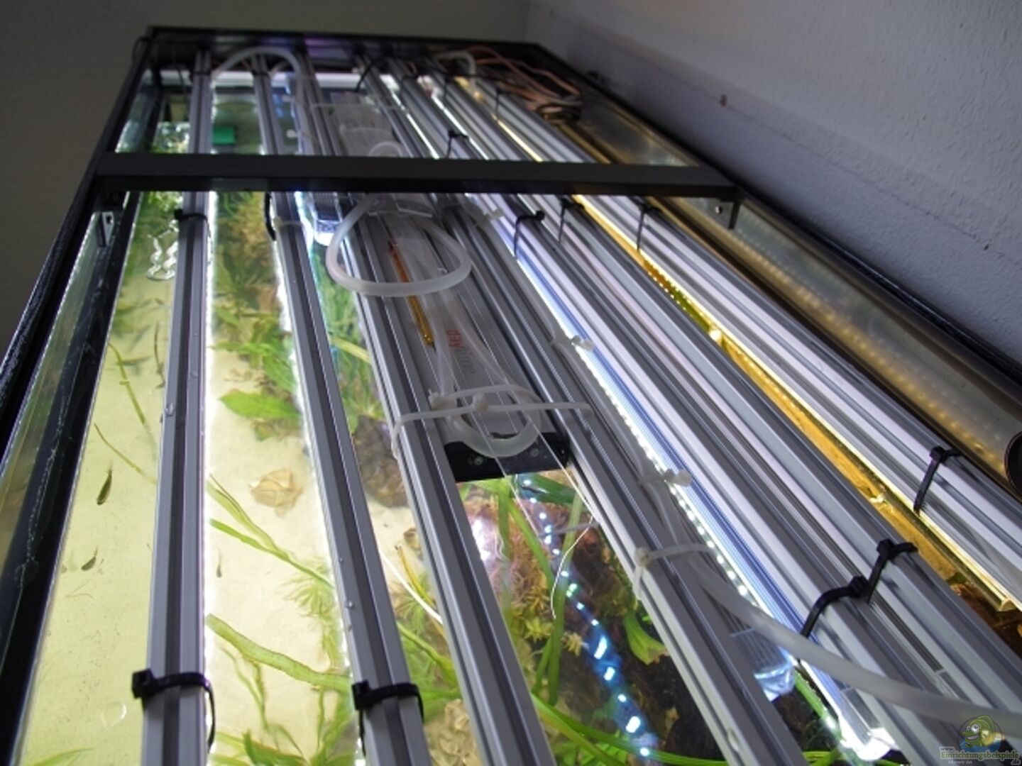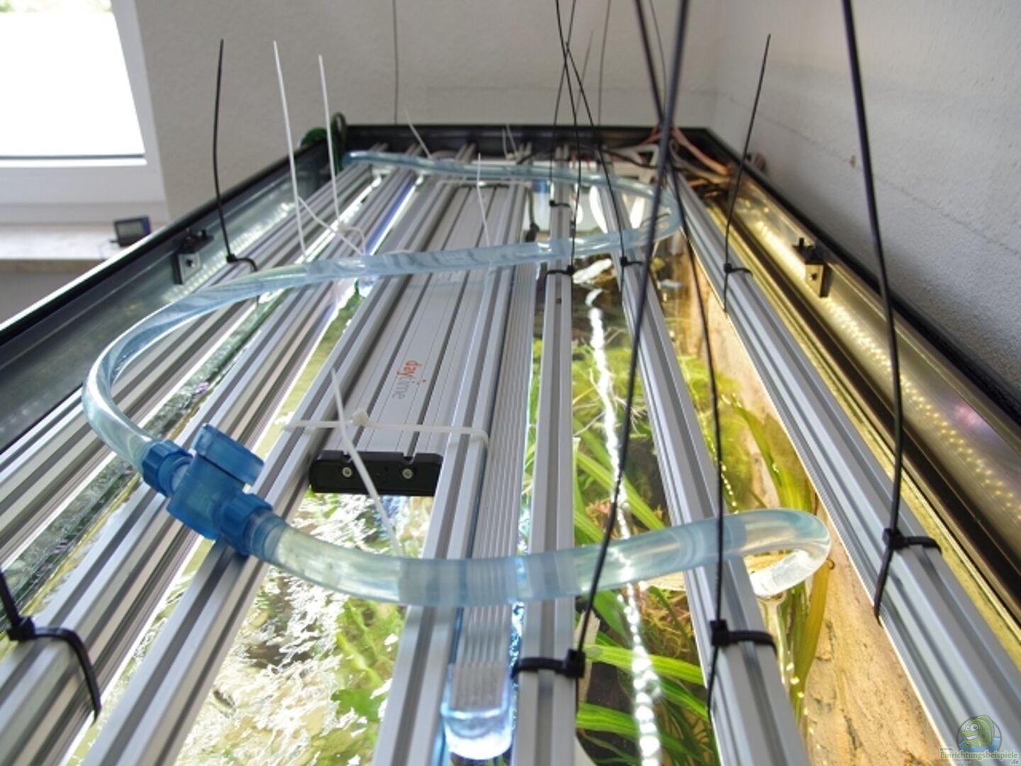 Die Leisten habe ich an den Alu Profilen befestigt und zwischen Alu Profil und LED Gehäuse befindet sich noch ein Silikon Schlauch durch den ständig Wasser flie??t solange die LEDs leuchten. Das Wasser läuft dann in das Becken zurück und beheizt es somit zu einen gewissen Teil.