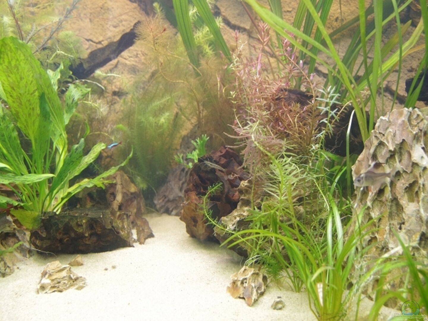 Reiner Sand mit einer Körnung von 0, 4-0, 8mm. Feiner sollte man bei Aquarien nicht gehen. Der Sand ist Kantengerundet und wurde mehrfach gewaschen. Insgesammt wurden 50kg verbaut. Von Farbkies oder ähnlichem halte ich nicht sonderlich viel da es oftmals nicht natürlich aussieht.