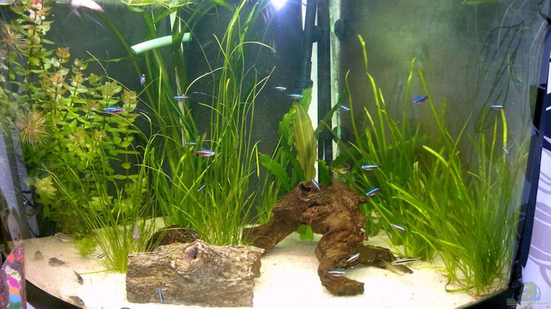 So erstmal: Ein Eckaquarium ist immer schwierig einzurichten. Du hast schon einen guten Ansatz geschafft, aber es ist noch verbesserungsfähig. Vielleicht durch eine schöne dominante Rotholzwurzel? Und ein paar kleinere Pflanzen mehr im Vordergrund?