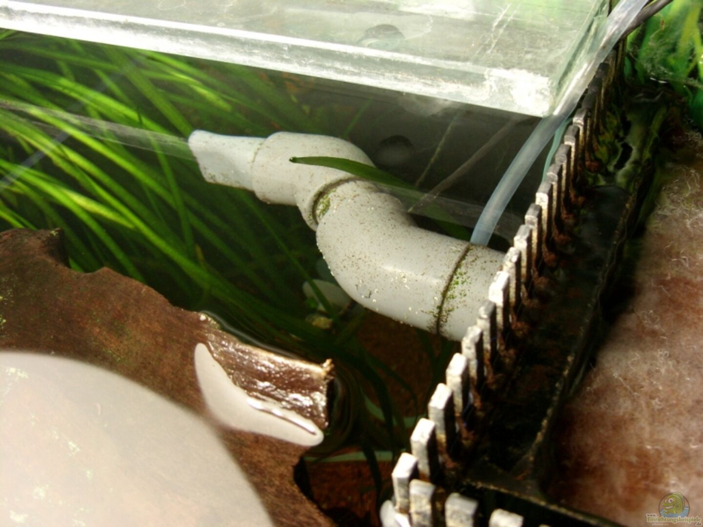 Der Wasserablauf erfolgt über einen ??berlaufschacht als Rieselfilter mit Filterflies auf der Rieselplatte als Vorfilter, anschlie??end grobe und feine Filterwatte, ca 5 Liter Filterschwammwürfel und 5 Liter gro??e Bioballs.
