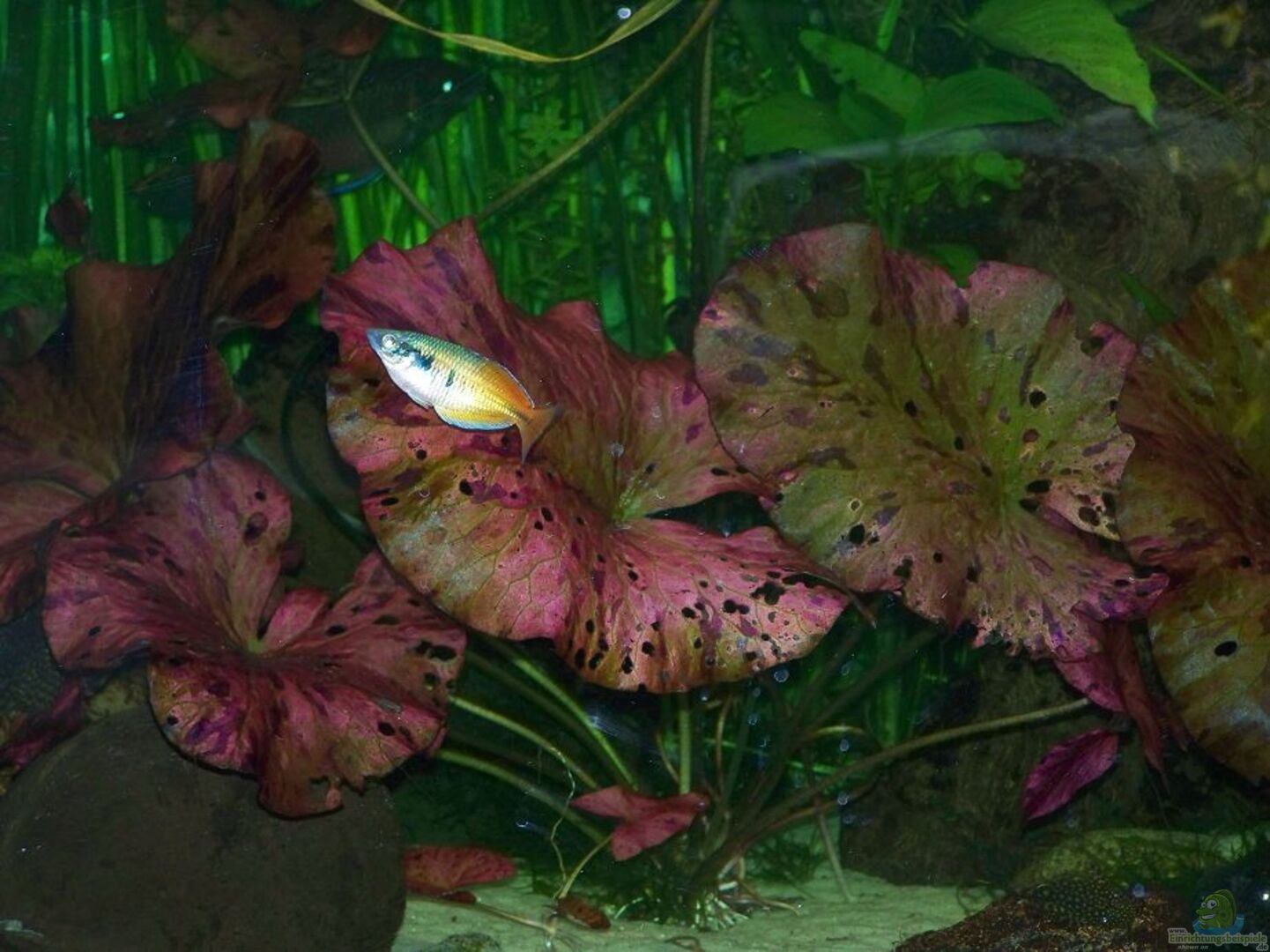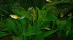 * Als Rückwand habe ich einfach schwarz-graues Krepppapier hinters Aquarium platziert und zwischen Glas und Papier ein paar künstliche Pflanzen geklemmt. Habe dadurch eine gute Tiefenwirkung erreicht. Die Valisnerien im Hintergrund passen gut dazu.