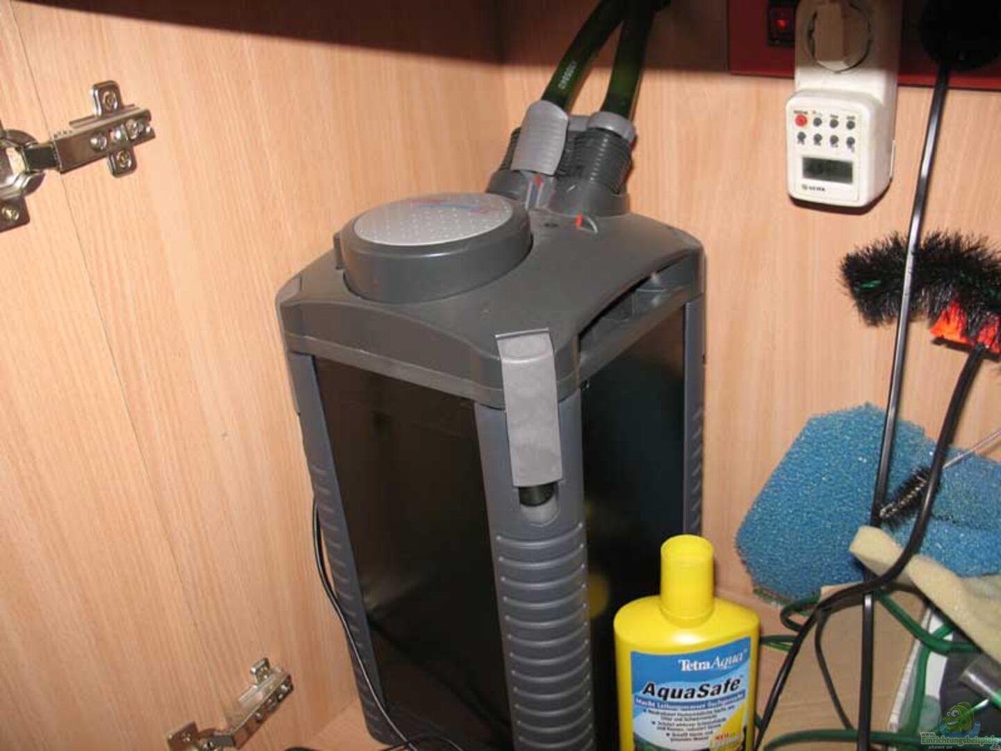 Es läuft noch ein 2 Kleinerer Aussenfilter von Eheim Prof.2 für 300 Liter Becken Dieser ist nur mit Weiser Filterwatte besrück so habe ich weniger Schwebeteilchen im Becken