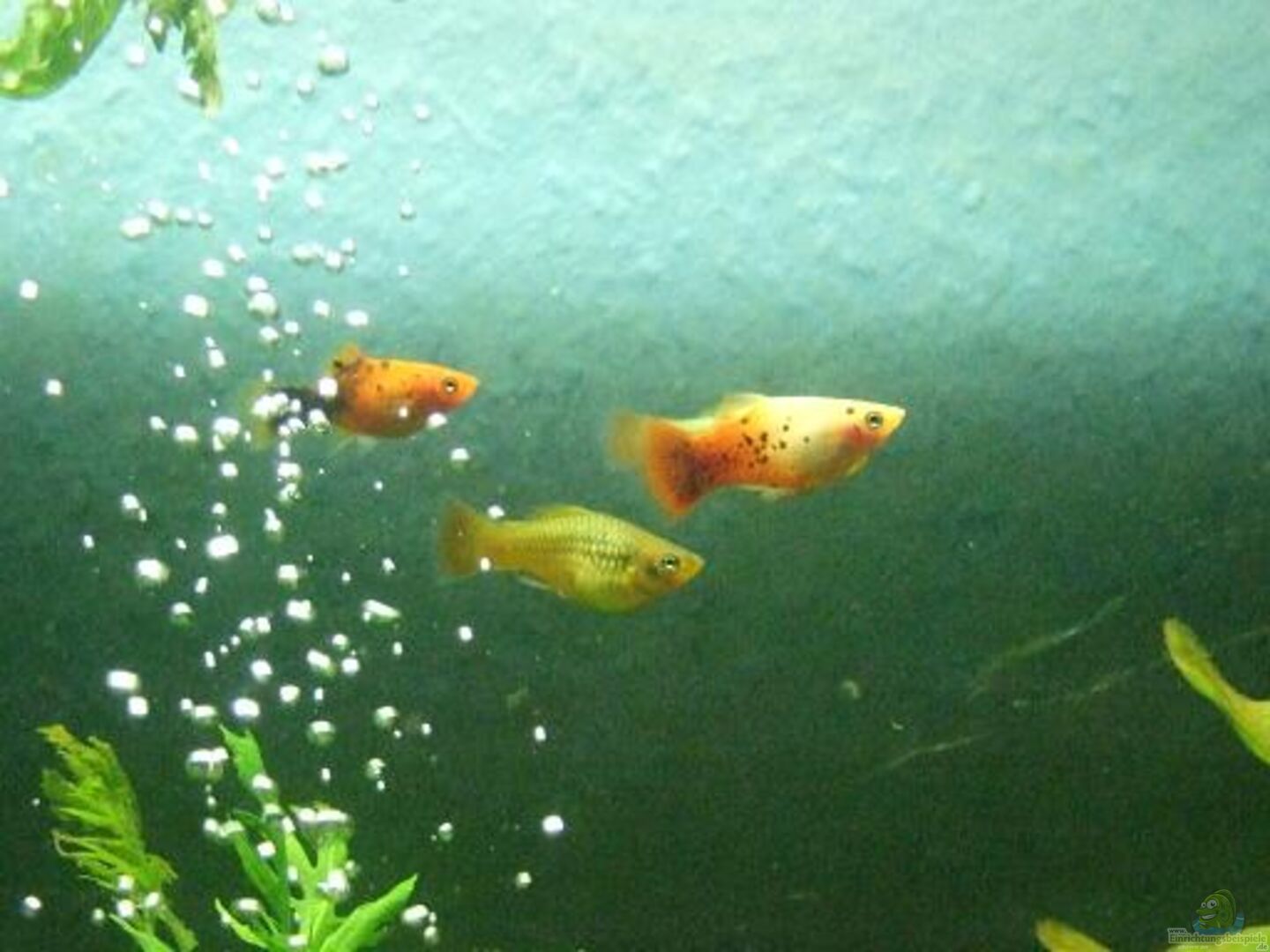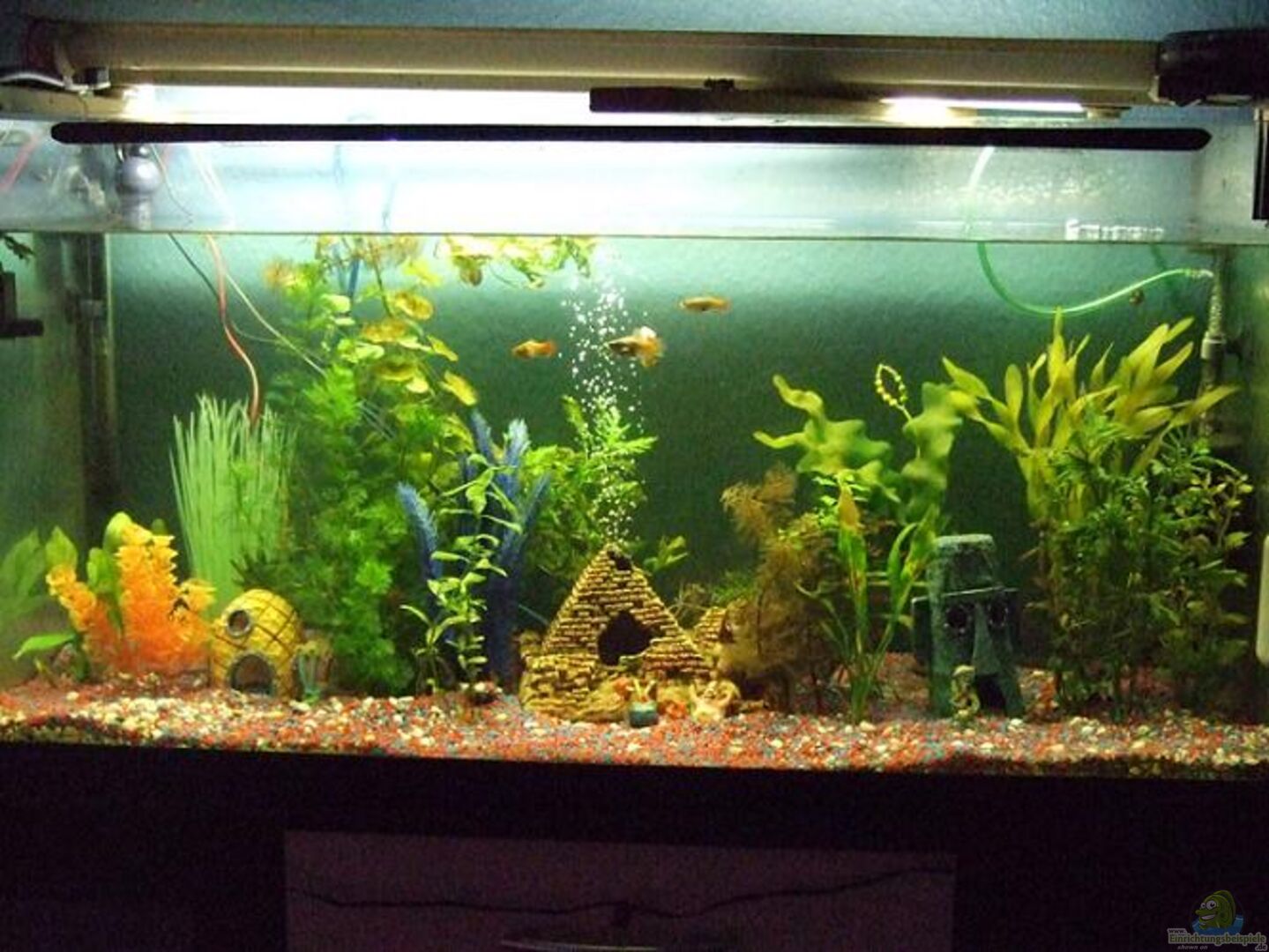 Dieses Becken dient mir einzig und allein zur Zucht von Lebendfutter für meine Oskars. Die Einrichtung ist daher aufs zweckmä??ige beschränkt. Ich lege daher keinen Anspruch darauf, dass das Becken besonders ´naturnah´ ist. Die Spongebob-Einrichtung wird von den Platys sehr gut als Versteckmöglichkeit und Strukturierung angenommen.