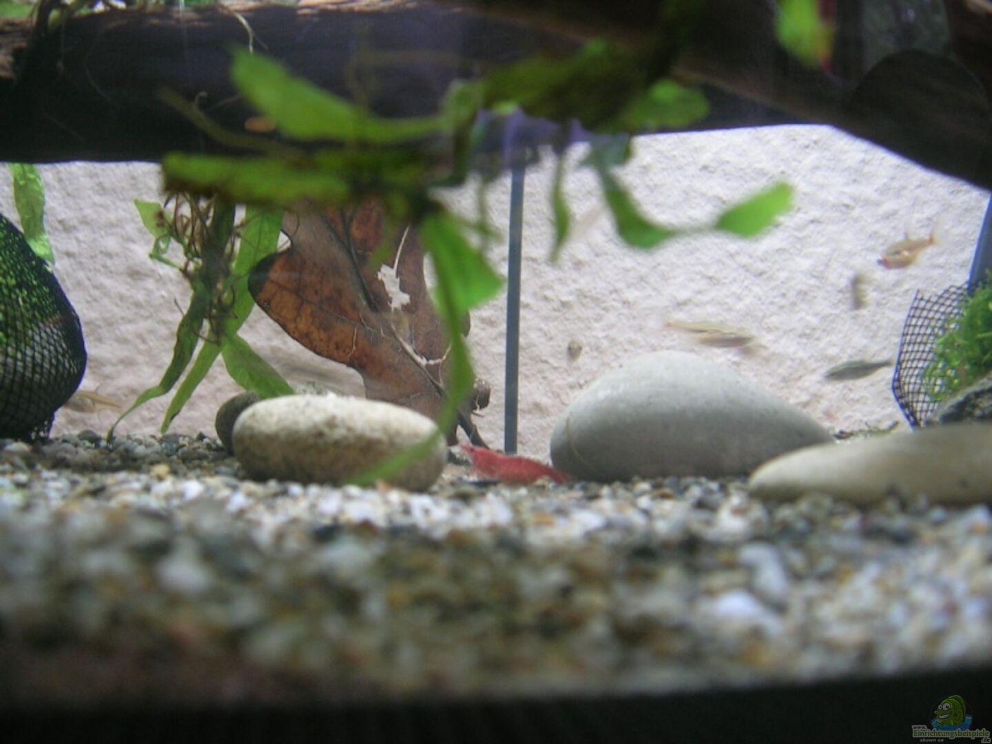 Das Riccia ist mit einem Fligengitter, das im Baumarkt zu erhalten ist, auf zwei von den vier gro??en Kieseln festgebunden.