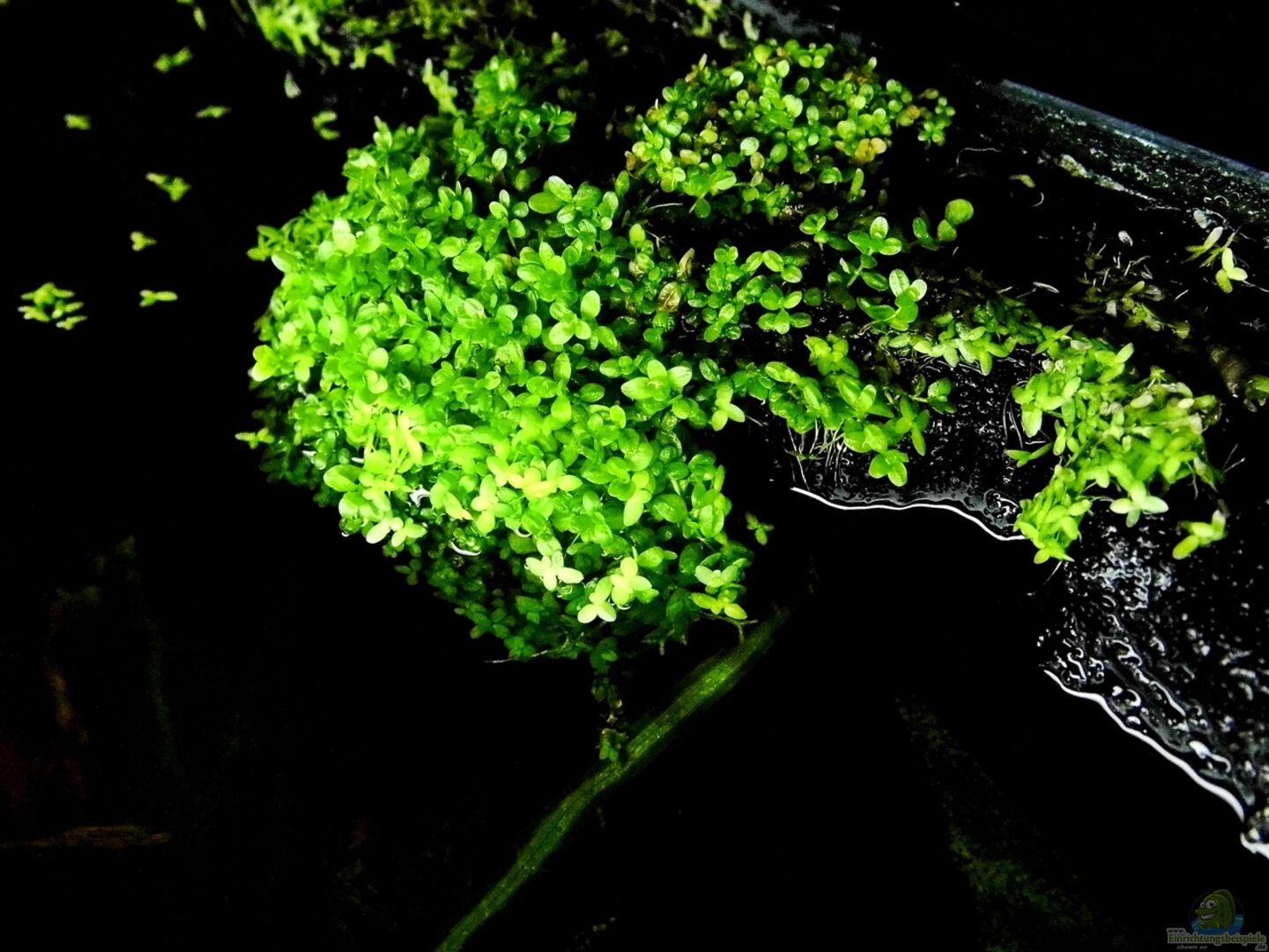 Die kleine Wasserlinse hat sich an einen Teil der Rückwand angesiedelt, sie zieht sich zum Teil über und unter das Wasser. Die Ansammlung besteht nun aus hunderten von Wasserlinsen , die sich nun nicht mehr als Schwimmpflanze , sondern als Aufsetzpflanze darstellt. Die Lemna miror hat so einen starken Verbund gebildet , dass eine Ablösung durch die Wasserströmmung nicht mehr möglich ist.