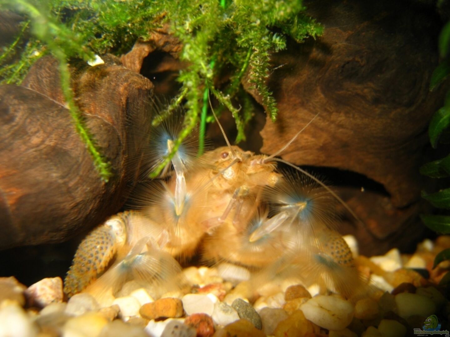 Die Garnele hat sich eine schöne Höhle unter der Wurzel gesucht, von der aus sie in der Strömung filtern kann. Aber die Grö?e ist schon bedenklich und ich werde sie wahrscheinlich gegen ein paar Amanos eintauschen.