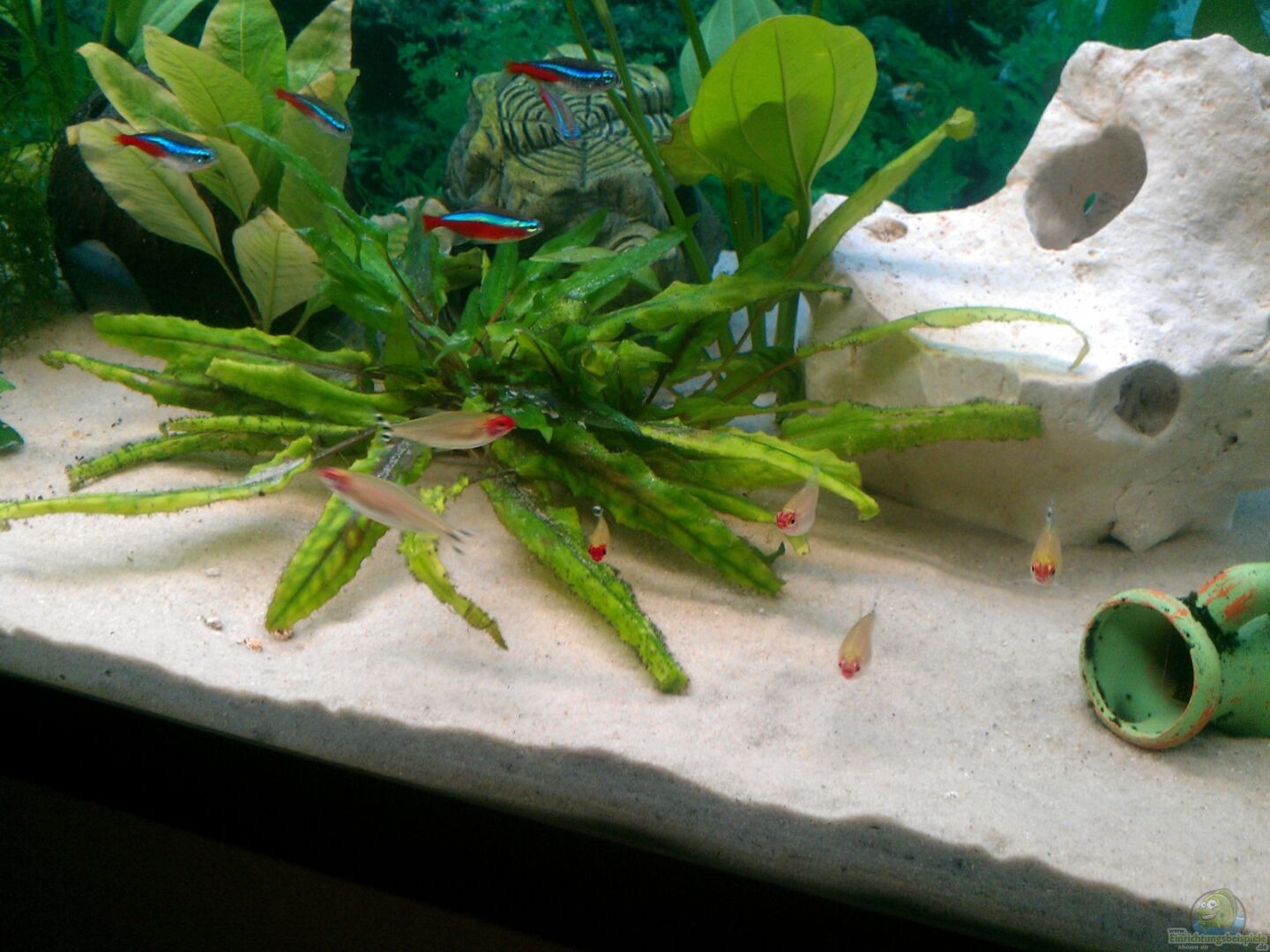November 2012 eine Gruppe von ca. 15 Garnelen ist zugezogen, das Piratenschiff wurde entfernt, zwei Babyantennenwelse sind dazugekommen, lassen sich aber nicht blicken aufgrund der vielen Versteckmöglichkeiten (u.a. Rückwand)