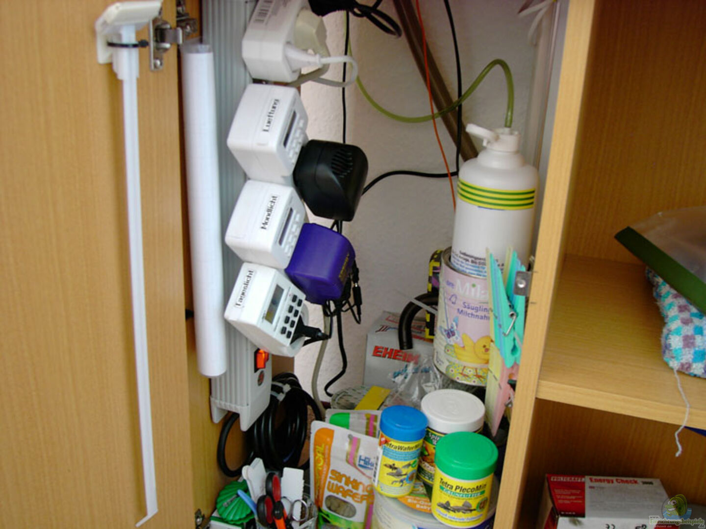 Strömungspumpe mit 800L/h hiter der Rückwand sorgt für ein wnig Strömung, Bio Co² Anlage Marke Eigenbau mit Lindenholzausströmer, 2 Lüfter die warme Luft vom Aquarium absaugen um die Kondensatbildung an der Abdeckung zu verhindern, Jäger Regelheizer 150W