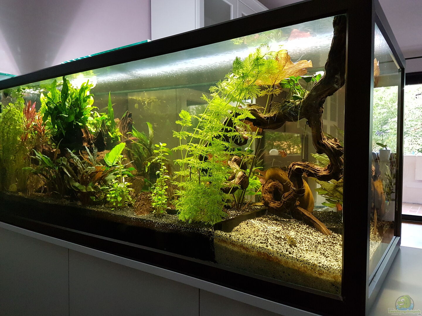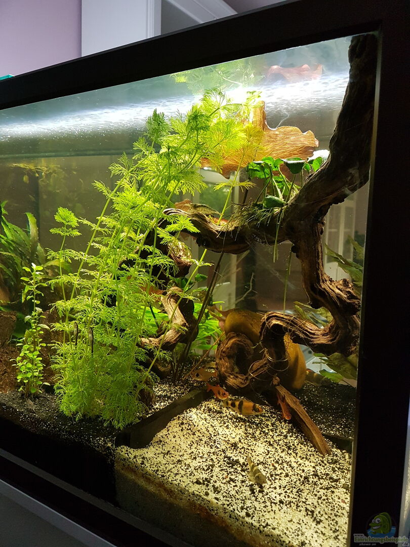 Sehr schön dein Raumteiler und der Besatz passt auch gut. Persönlich würde ich noch mehr Pflanzen, Wurzeln, etc. einsetzen, so dass mehr Rückzugsmöglichkeiten entstehen. Entwickelt sich aber vielleicht noch. Ist ja noch recht frisch eingerichtet.