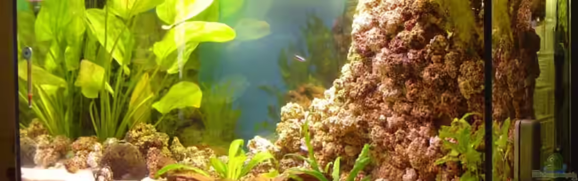 Selbstgebautes Riff aus Aqua Terra Steinen und Plexiglas.Carbo Plus, Stabheizer und Ansaugung wurden dahinter versteckt. 2 Kies / Sandarten durch verklebte Plexiglastrennung auseinandergehalten damit sie sich nicht zu stark vermischen. Unterschrank ist vom Möbel Hofmeister und wurde komplett umgebaut mit Massivholz und Metallwinkel. Die obere Betonverschalungsplatte wurde mit einer weissen Folie bezogen damit es zum Schrank passt.Filter, Zeitschaltuhren, das Carbo Plus Steuergerät, eine Tetra UV-C400 und weitere Technik wurde sauber im Schrankinneren montiert.An der Schrankrückseite sind sämtliche Schläuche und Kabel mit Panzerrohrschellen verlegt und geführt.