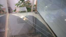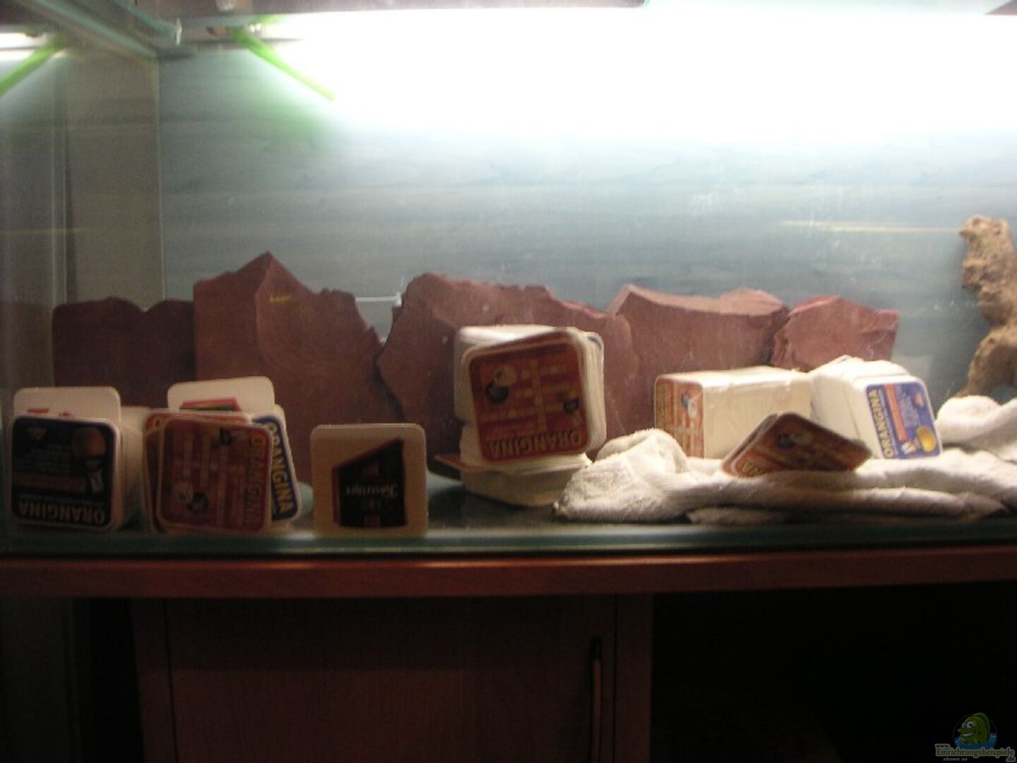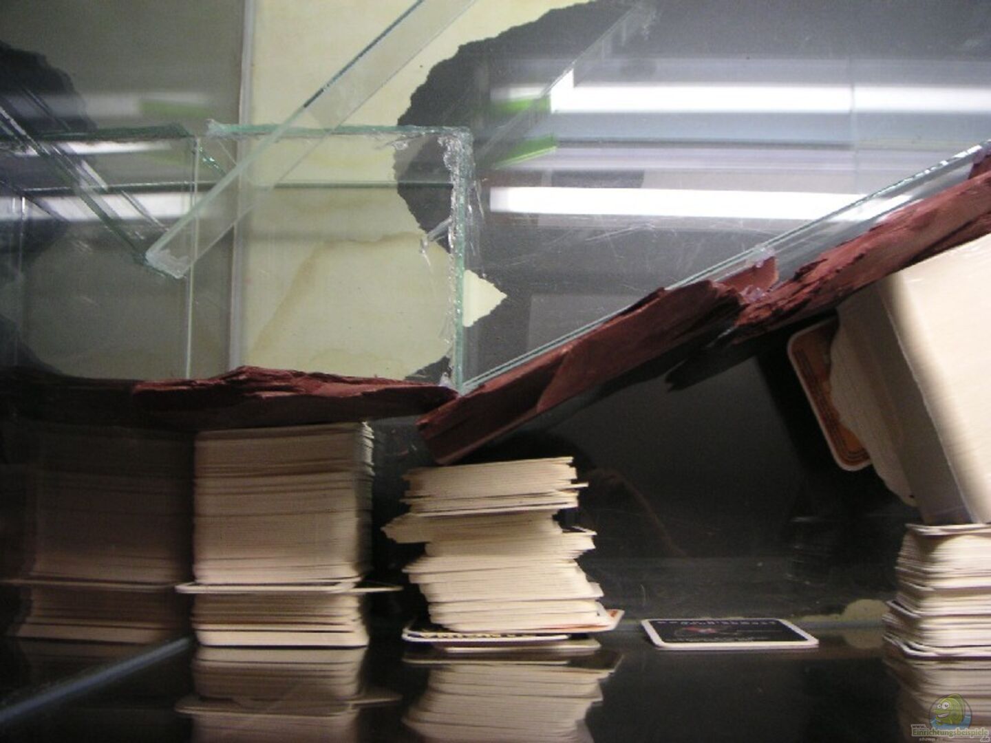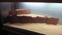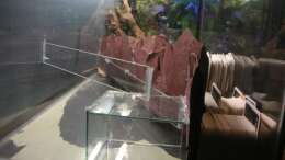 Die Schieferplatten habe ich an Glasstreifen angeklebt, die wiederum an den Seitenscheiben angeklebt sind. Ebenfalls aus Glas habe ich eine Höhle geklebt, die sich unter der linken Terrasse befindet.