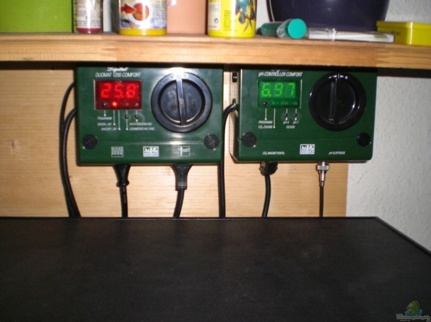 Co² Zufuhr über die CO.C.200 Biofilterstation.Geregelt wird über den Dennerle PH-Controller 588 Comfort und versorgt wird das ganze über zwei 500g Flaschen (1 in Betrieb, die andere zum tausch) Geheizt wird das Becken über einen Dennerle Bodenfluter 25 Watt und einen Jäger Stabheizer 125 Watt.Die beiden werden geregelt von dem Duomat 1200 von Dennerle.
