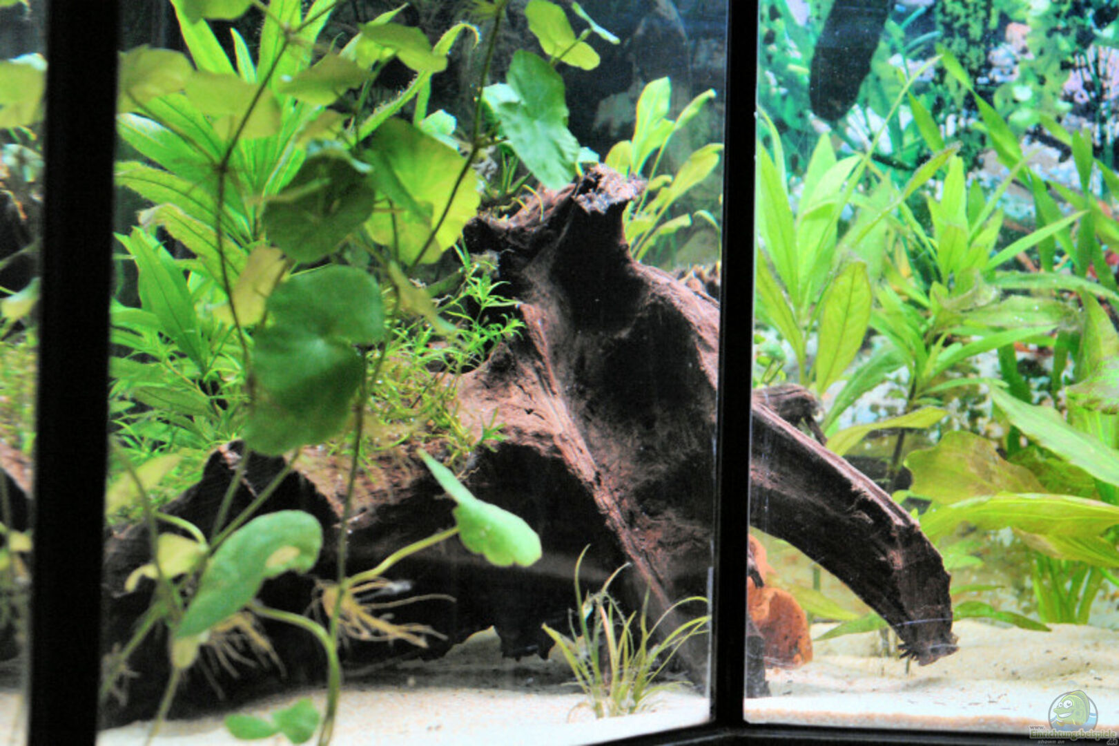 2 gro??e Jati Wurzeln. Die Linke ist flach und bildet unten 2 Höhlen. Sie ist mittlerweile ganz mit Javamoos zugewachsen. Die Rechte reicht bis zur Wasseroberfläche und verdeckt die Technik.