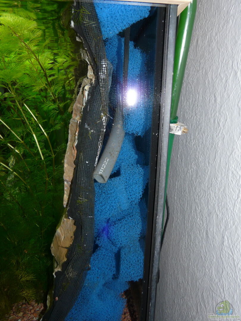 Die Rückwand stand gut 12 cm von der Aquariumwand ab. Der Fluter ist durchgängig verlegt. Hinter der Rückwand war ein gro??er HMF (als Filterwürfel, die ich mit einer Nylonschnur aufgezogen hatte) untergebracht mit einer Tauchpumpe. Das Aufziehen der Filterwürfel war gold wert, als ich die 3D Rückwand wieder entfernen musste. Innerhalb von 2 Minuten waren alle Würfel drau??en.