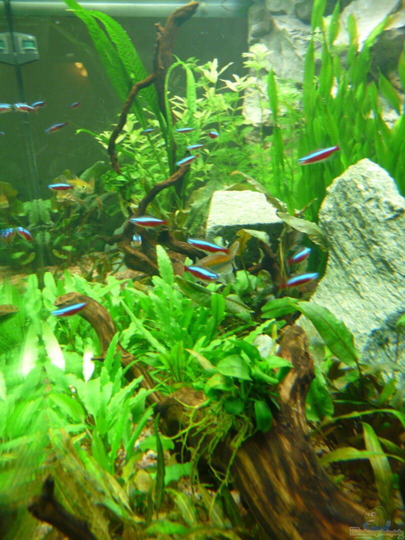 Es sieht aus, als würden sich alle pudelwohl fühlen. Bisher ist au??er ein paar harmlosen Grünalgen keine Algeplage zu verzeichnen. Die Grünalgen werden von den Garnelen gut abgeweidet. Ich werde die Garnelen vielleicht noch etwas aufstocken.