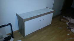 Der Unterschrank war von der Form her gut gemacht, nur leider wurde er vom Vorbesitzer wei?? angestrichen und sah nicht mehr so schön aus. Ich habe ihn also abgeschliffen und mit Folie passend zu unseren restlichen Möbeln beklebt.