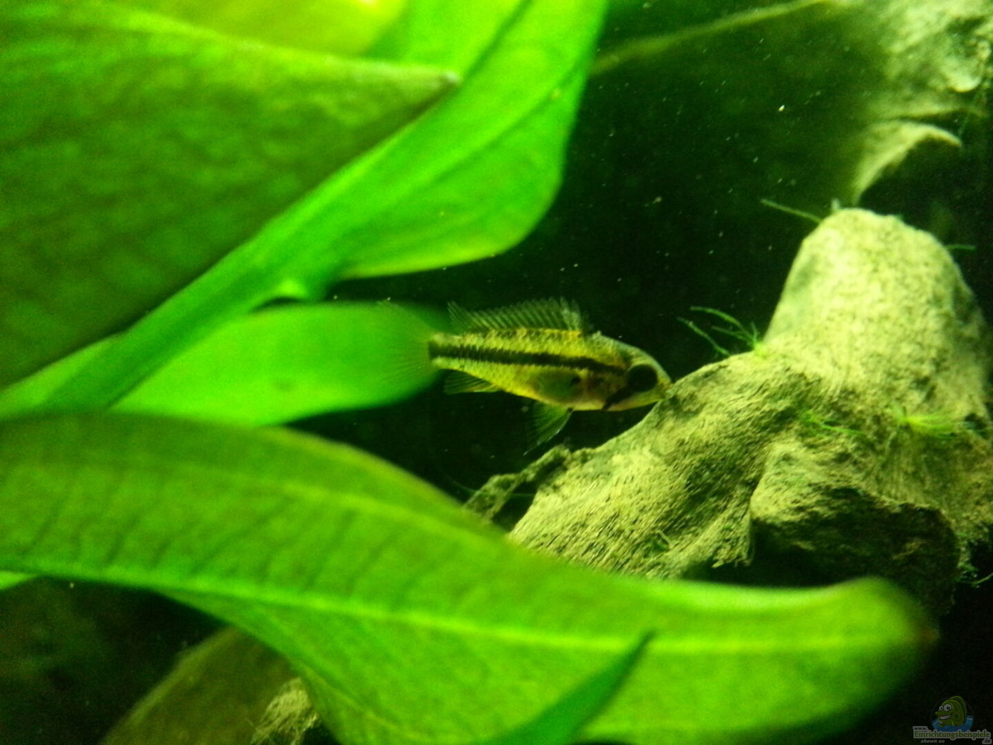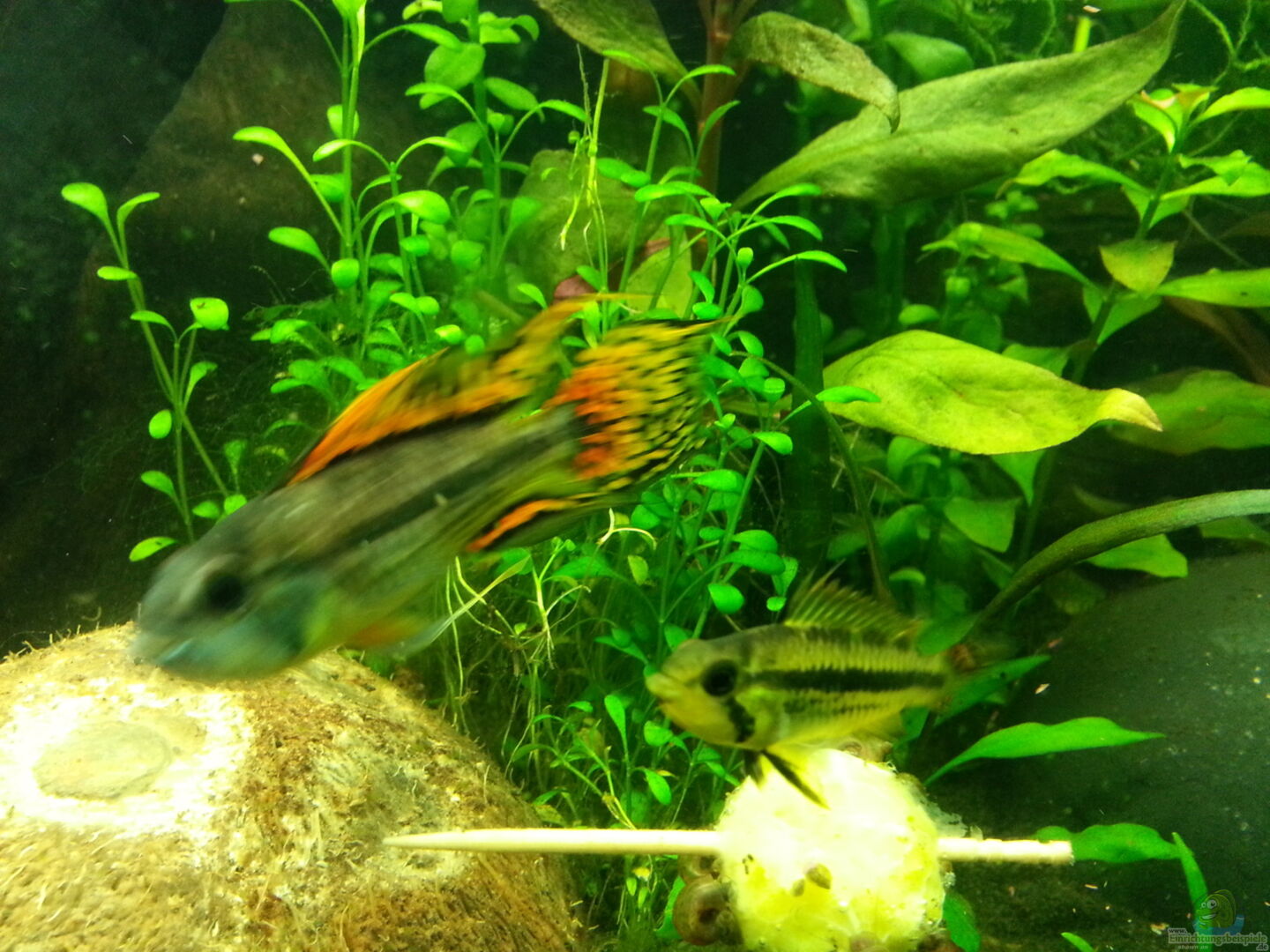 Die Kakadu-Zwergbuntbarsche haben wohl während des Urlaubs gelaicht. Heute hab ich mehrere Jungtiere rum schwimmen sehen. Mama Barsch beschützt sie eifrig.