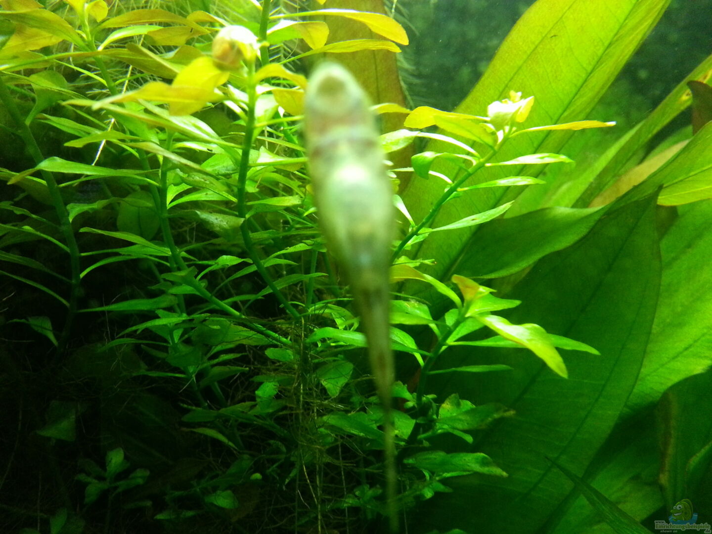 Der blühende Echinodorus hat jetzt einen emersen Ableger. Da ich aber ein fauler Pflanzengie??er bin und im Blumentopf somit nichts damit anfangen kann, muss der wieder unter Wasser. Hab den Trieb jetzt umgedreht, sodass das junge Pflänzchen schon mal nasse Fü??e hat. Hoffentlich bilden sich Wurzeln...