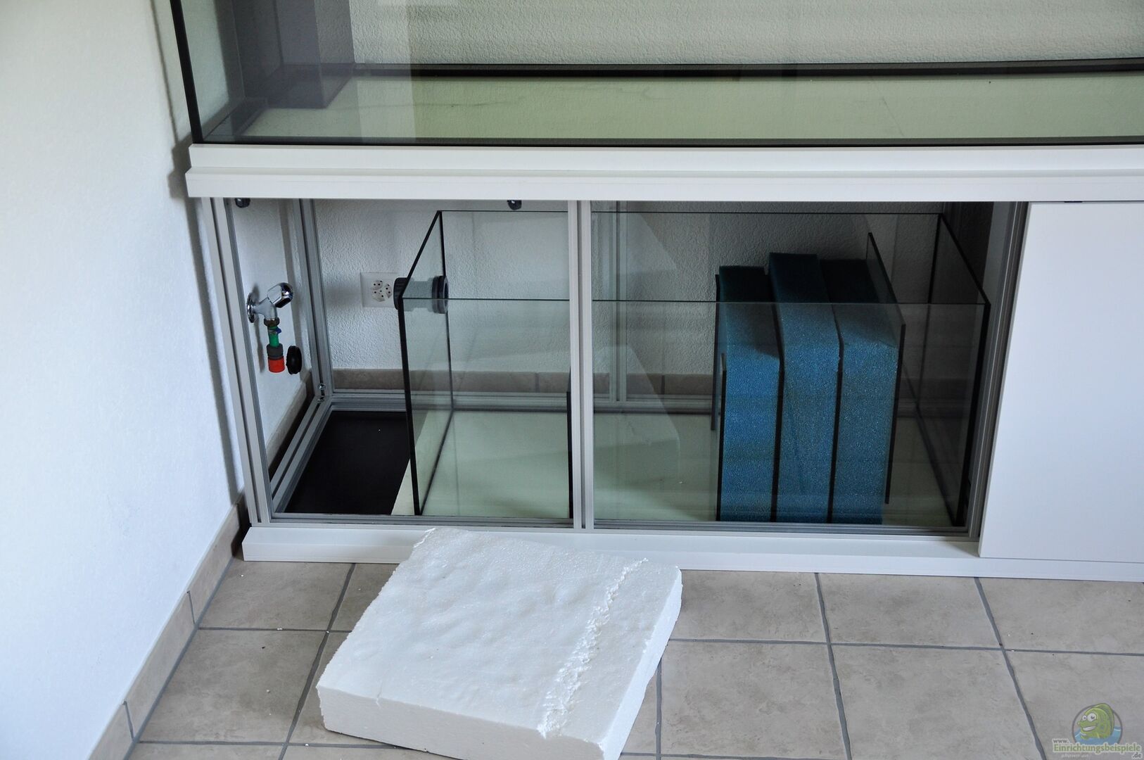 Der Unterschrank wird durch zwei Schiebetüren "verschlossen". Im linken Teil befindet sich die ganze Technik inkl. Filterbecken. Rechts stehen mir vier Ablageflächen für den Kleinkram zur Verfügung.