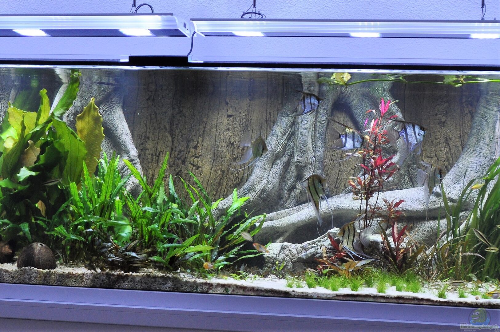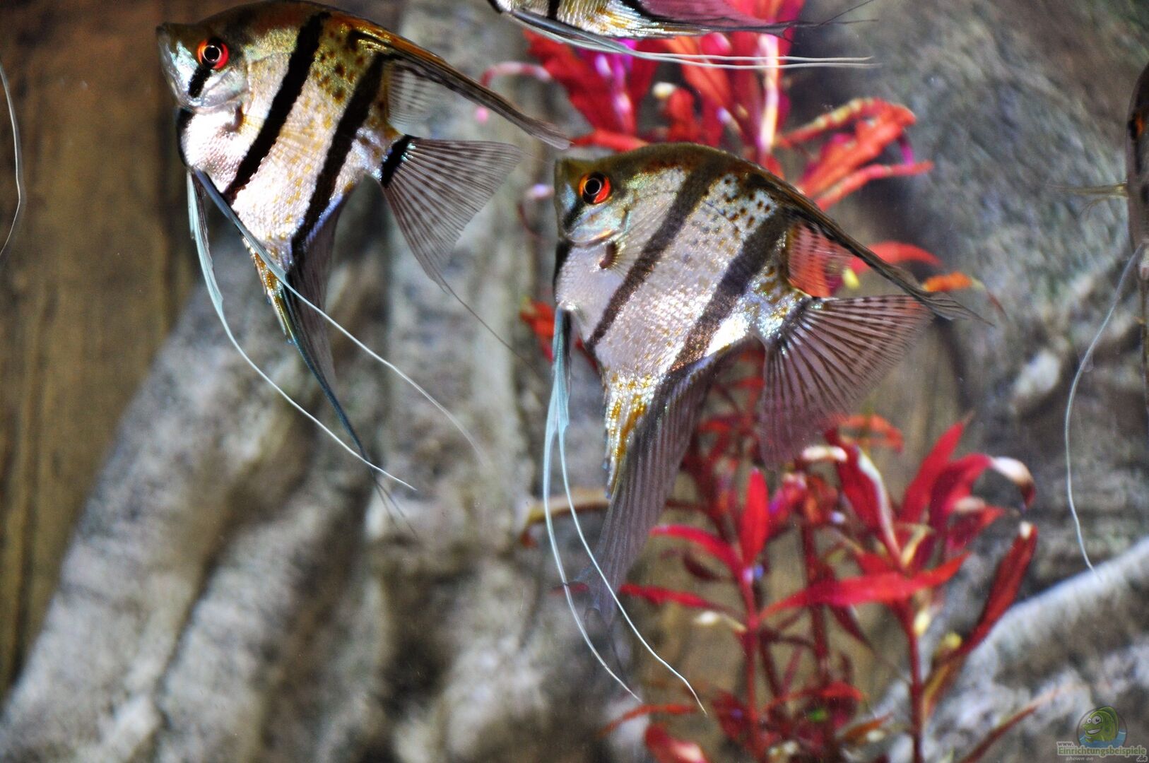Das Becken läuft sei gut zwei Monaten ohne Probleme. Ich habe die CO2 - Versorgung um eine zweite Flasche erweitert. Zusätzlich habe ich den Fischbestand kurz vor Weihnachten um 7 halbwüchsig Skalare (Pterophyllum scalare) erweitert. Es handelt sich um Fische, welche der Wildform aus Peru sehr nahe kommen, stammen aber aus einer privaten Zucht. Somit ist mein Tank nun voll.