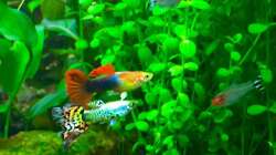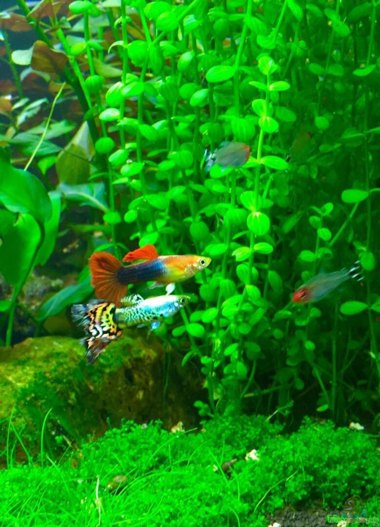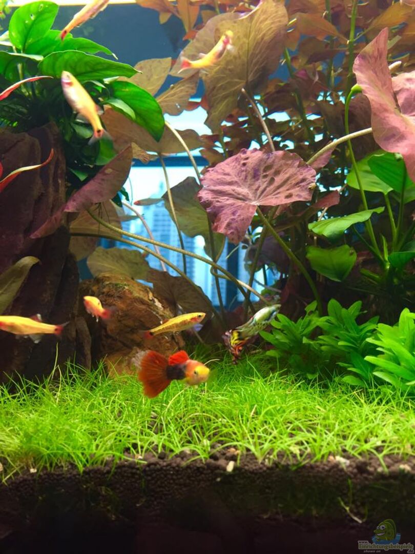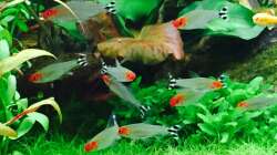 Der Fokus des Beckens liegt klar auf den Pflanzen und weniger auf dem Besatz. Je nachdem ob zusätzliches CO2 nötig ist wird der Besatz eventuell noch leicht aufgestockt, dann vermutlich mit weiteren Exemplaren der bestehenden beiden Schwärme. Die drei Guppymännchen sind ein Restbestand, der nicht weiter aufgestockt wird.
