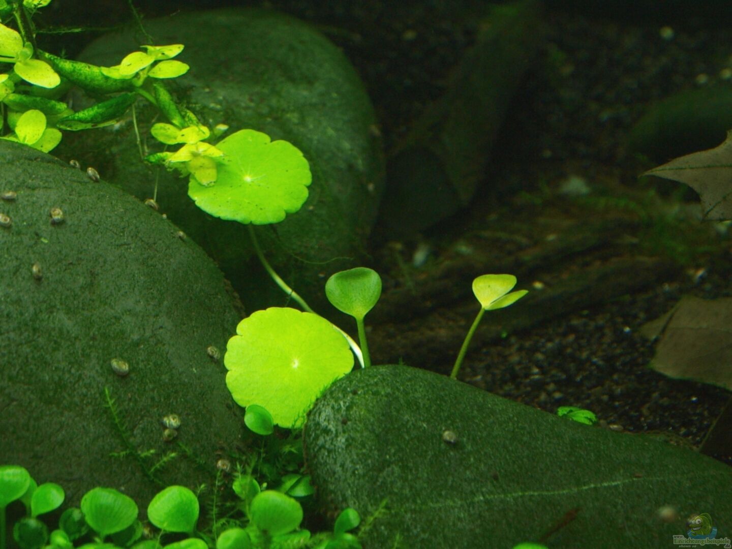Anfang des Jahres hab ich mit einigen anderen Aquarianern Pflanzen getauscht und bekam, zu meiner gro??en Freude, Hydrocotyle sp.Japan. Im linken Teil des Beckens eingepflanzt erhellt sie das etwas dunkelgrün dominierte Layout. Auch aus einem Tausch kamen einige Blättchen Hydrocotyle verticillata hinzu.