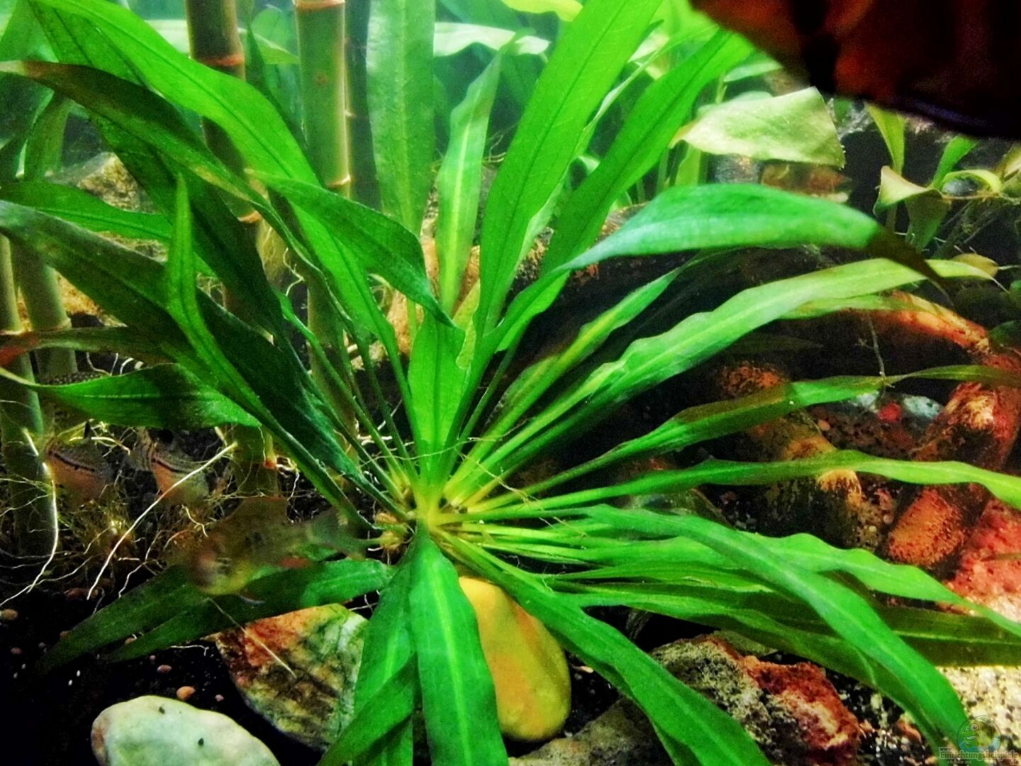 Anubias barteri var. nana , sie wächst langsam und kann deshalb von Algen befallen werden. Man kann sie mit Nylonschnur auf Wurzeln und Steinen fixieren, während sie anwächst. Beim Einpflanzen in den Bodengrund darf der Wurzelstock nicht bedeckt werden, da er sonst leicht fault. Ideal für Barschbecken.