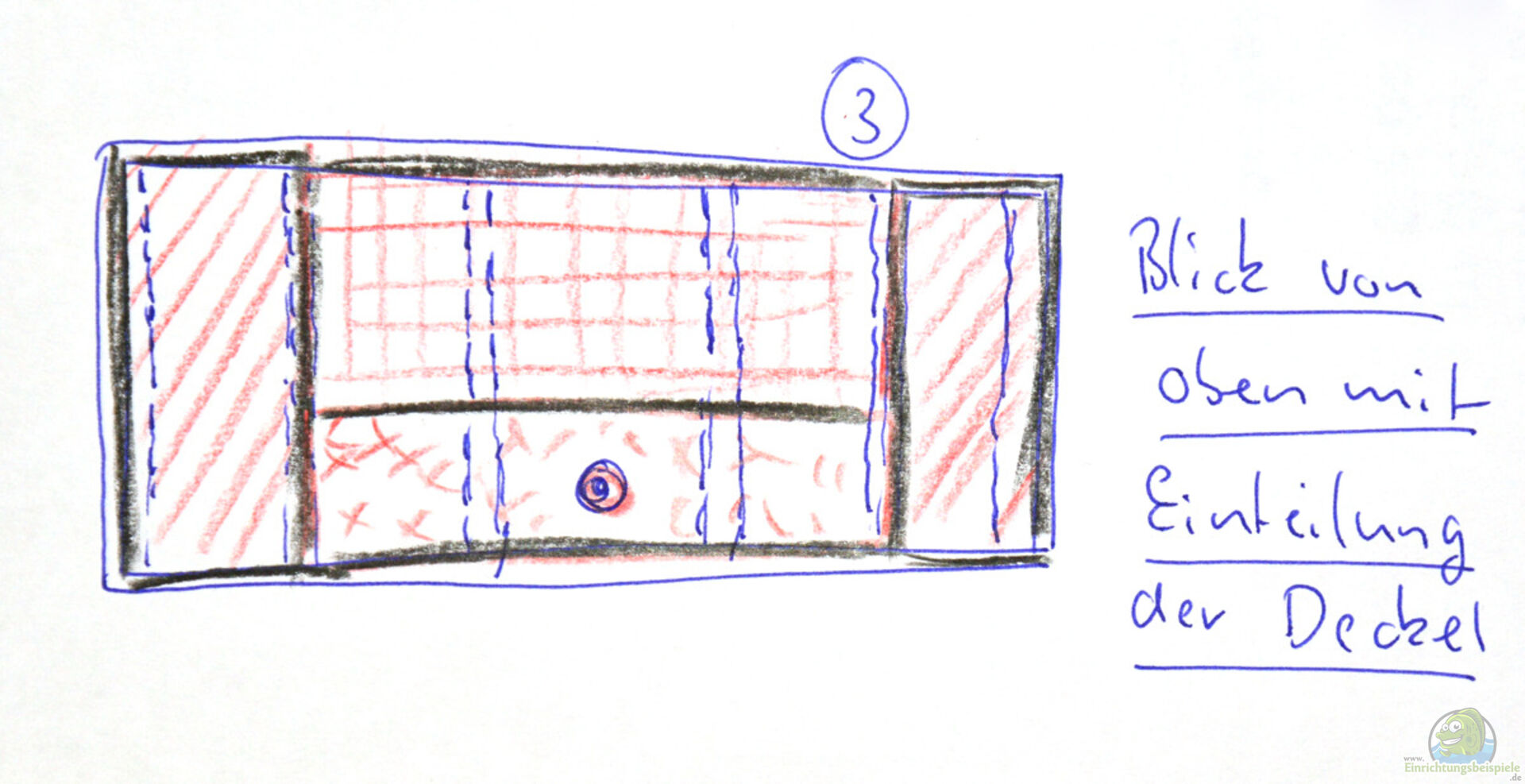 Aussen an den Rahmen habe ich Fussbodenzierleisten aus dem Baumarkt geklebt/geschraubt. Die Leisten wurden auf Gärung geschnitten um "schöne" Ecken zu haben. Höhe der Leisten ist ca 10cm. Wichtig ist, dass die Zierleiste oben ca 0, 5 cm über den Tragrahmen übersteht. Diese Kante wird später für die Deckel benötigt. [Skizze 2 und Skizze 3]