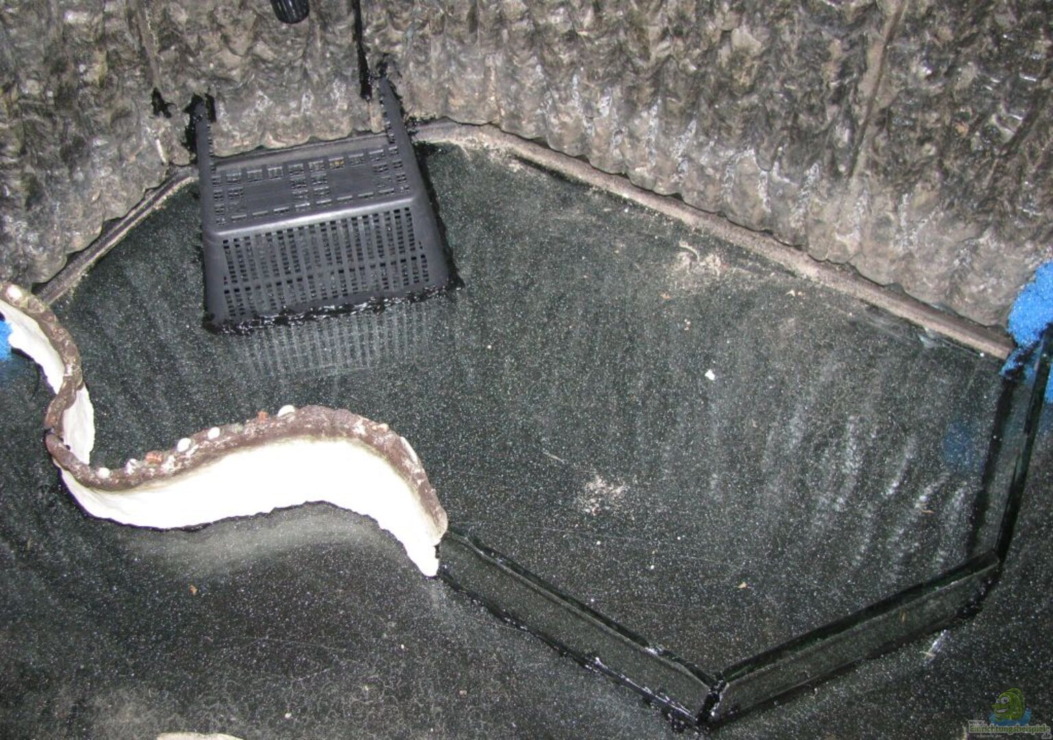 Die endgültige Form der Terasse ist spontan endstanden, ebenso die vielen Höhlen darin. Weil das ganze noch ohne die Bepflanzung wie eine Burg aussah, habe ich es Schmerlenburg getauft. Die Fische können sich allerdings dort nicht verschanzen, denn das "Dach" ist abnehmbar und auch alle Röhren lassen sich rausnehmen.