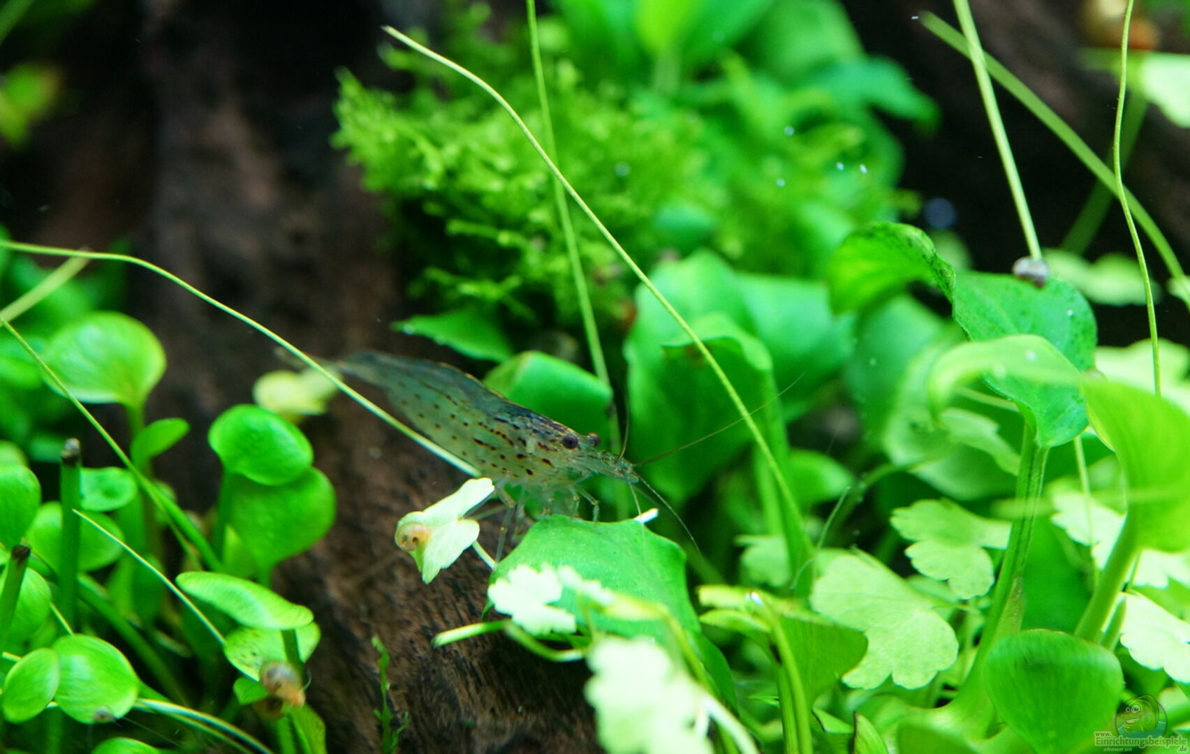 Solange die Pflanzen optimale Wachstumsbedingungen haben, finden sich fast keine sichtbaren Algen im Becken. Daher muss ich Garnelen und Schnecken zufüttern, damit sie nicht verhungern. Winziger Redfire Garnelennachwuchs findet sich ständig irgendwo im "Dschungel", wird aber von den Perlhühnern auch immer wieder dezimiert, so dass es nicht zur ??berpopulation kommt.