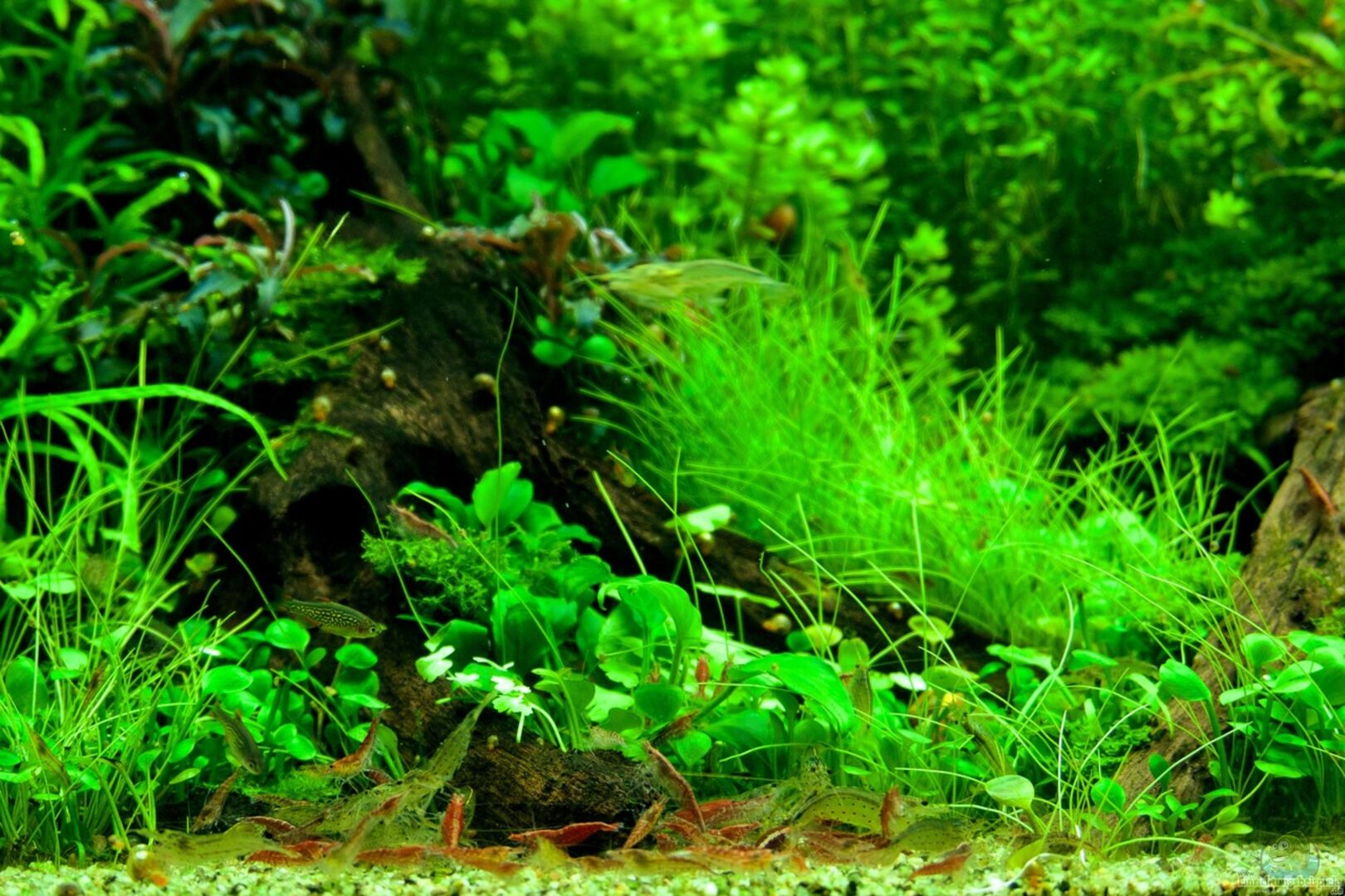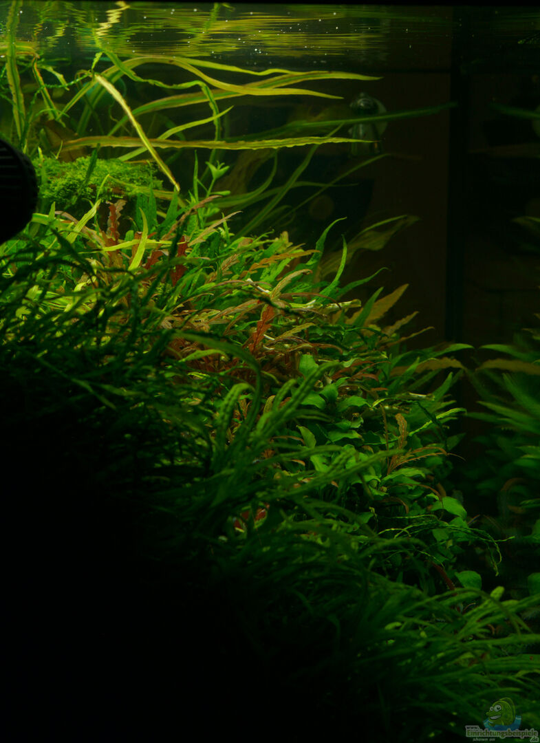 Nach 2 Wochen sieht man langsam das beginnende Pflanzenwachstum. Beginne deswegen jetzt mit leichter, täglicher Eisenvolldünger und Kaliumnitratzugabe. Amanogarnelen sind wieder eingezogen.