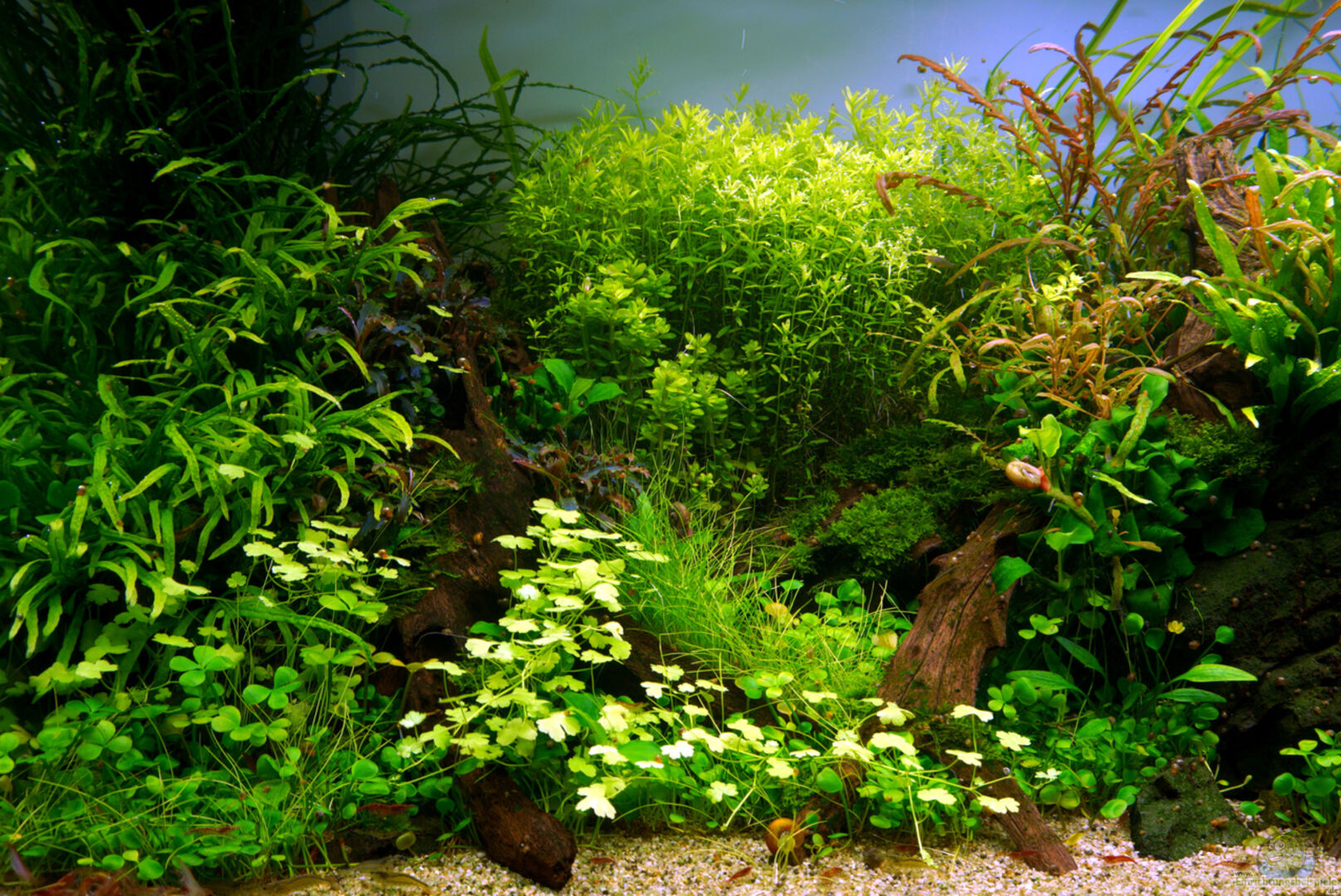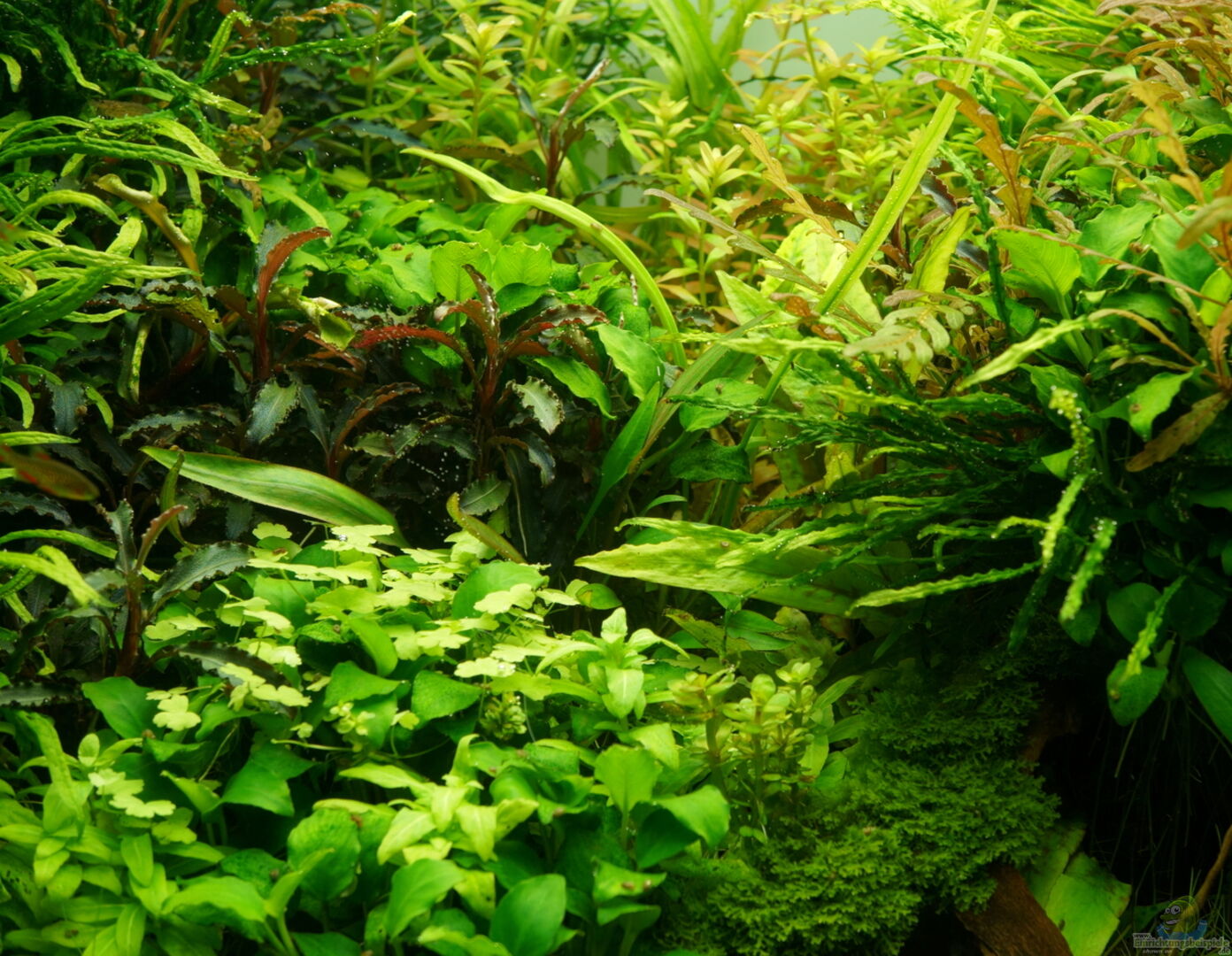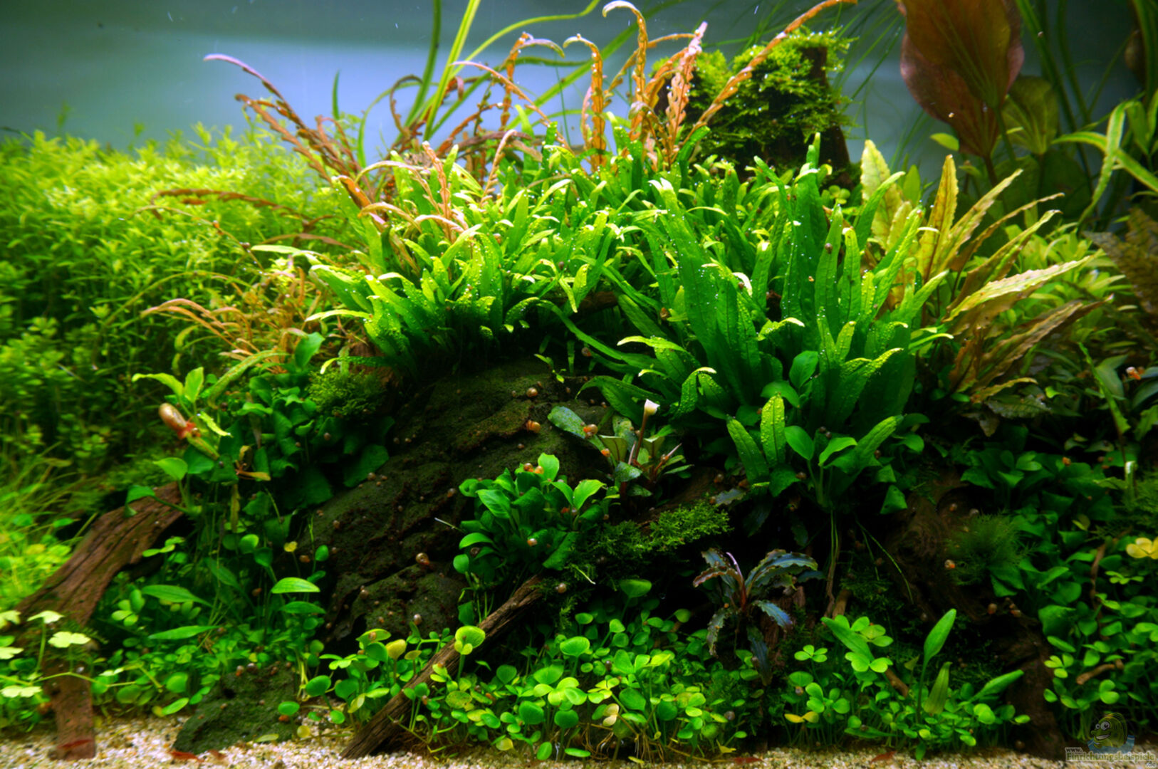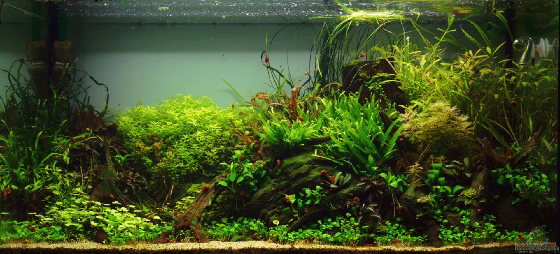 Das Becken ist in erster Linie ein Pflanzenbecken, bei dem die tierischen Bewohner aber trotzdem nicht zu kurz kommen sollen. Ich habe mich dabei zwar am Aquascaping orientiert, habe aber nicht den Anspruch eine perfekte ??berwasserlandschaft darzustellen. Ein halbwilder Pflanzendschungel ist mir lieber und auch viel pflegeleichter.