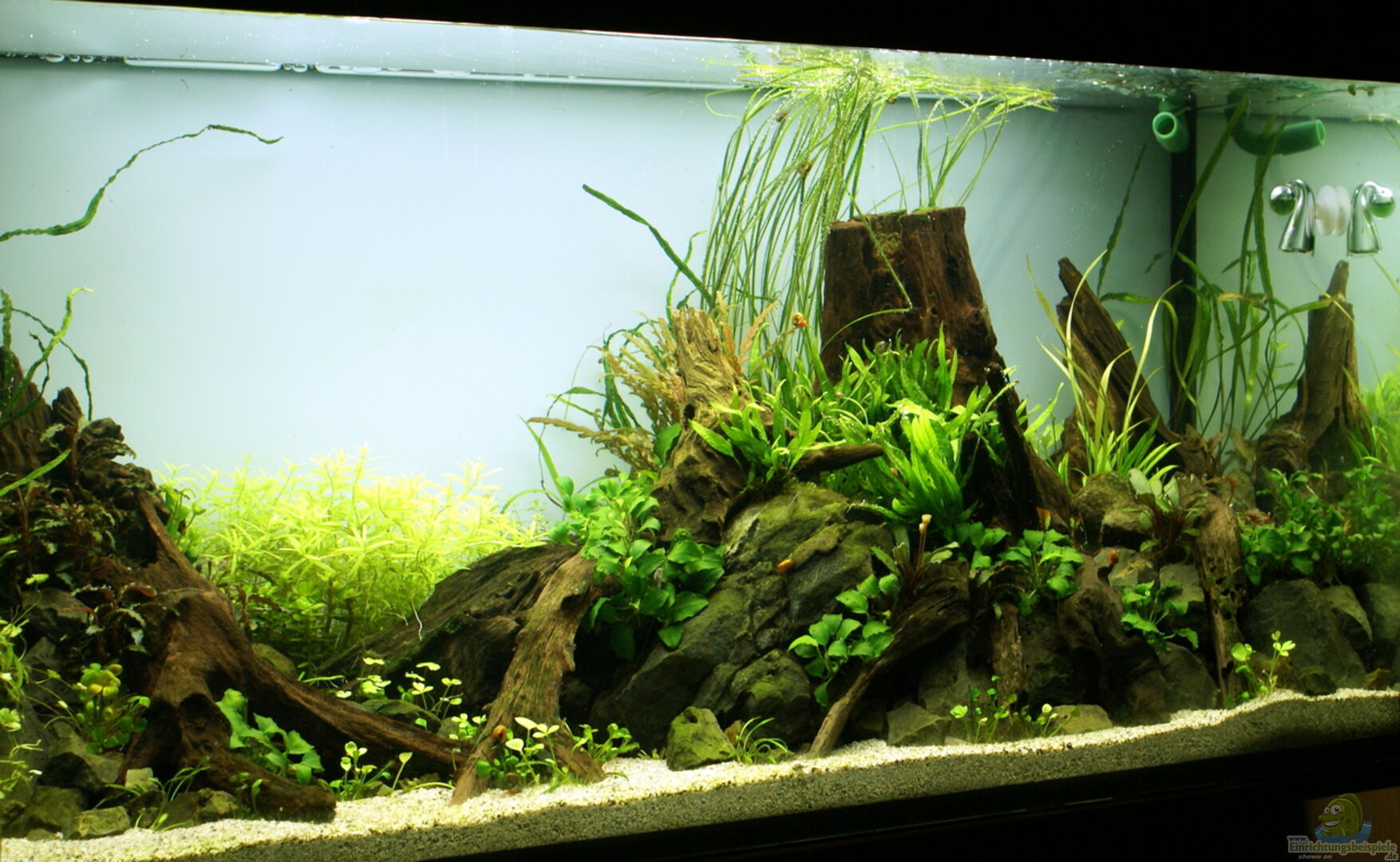 Das Aquarium ist vor allem ein Pflanzenbecken ohne gro??e Besonderheiten. Das Becken selbst ist ein über 15 Jahre altes Juwel-Standardbecken mit Längsstreben. An der Rückwand wurde eine selbstklebende Milchglasfolie aus dem Baumarkt angebracht.