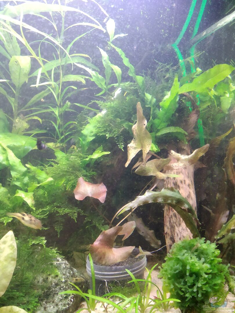 Bei dem Becken handelt es sich um ein Low Tech Gesellschaftsbecken welches sich nach und nach aus einem ursprünglich reinen Artbecken für die Erbsenkugelfische entwickelt hat. Die Lebendgebärenden habe ich ursprünglich mit der Intention angeschafft, dass die kleinen Räuber Erbsen den Nachwuchs erjagen können. Leider ist dies nicht der fall wie sich heraus gestellt hat. Auch die im Becken florierende Population von Zwerggarnelen wird von den Kugelfischen weitesgehend in Ruhe gelassen. Der Versuch einer eigenen Schneckenzucht war leider nicht von Erfolg gekrönt, sodass die Kugelfische eher selten in den Genuss dieser kommen. Laut diverser Meinungen aus dem Internet ist dies bei Zwergkugelfischen im Hinblick auf das bei diesen Tieren im Vergleich zu grö??eren Arten deutlich langsamere Zahnwachstum allerdings nicht sonderlich dramtisch und die Tiere nehmen die gebotene Diät aus gefrorenen sowie lebenden Artemien sehr gut an.